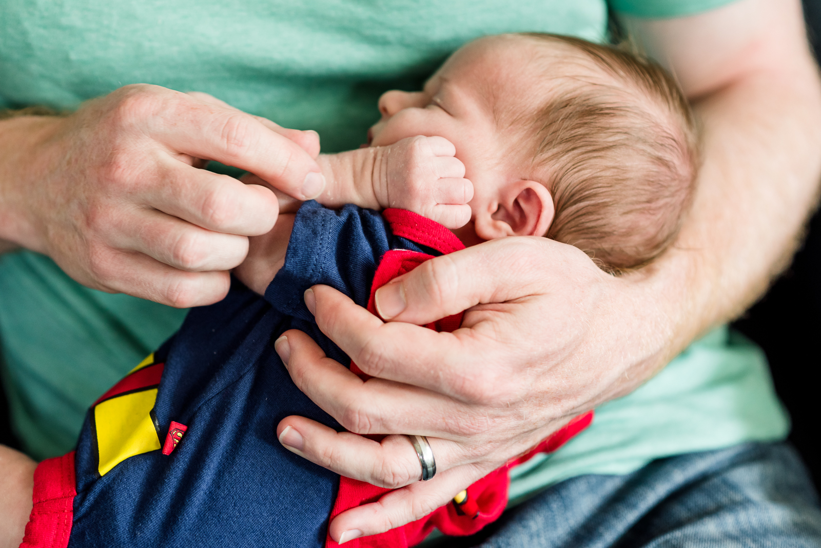 No, wait — it’s Superman! Kal is absolutely adorable in his Superman outfit, and it looks like Ryan will have to start studying his crash course! Costumes are always a great addition to a newborn photo session. Not only do they enhance the photo session by providing a theme, but they also make for very cute photos! If you need some tips on newborn photoshoots, check out our comprehensive guide!