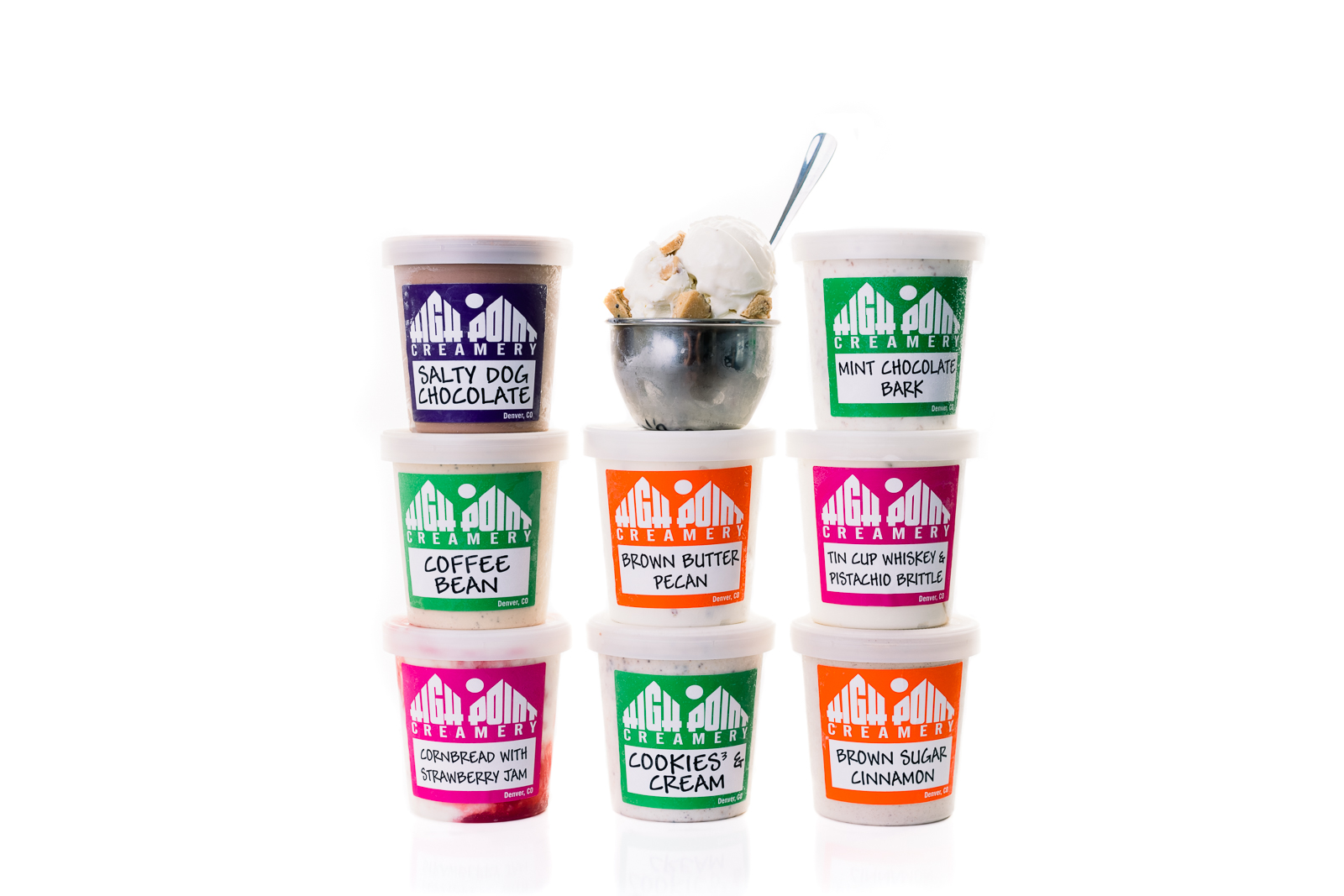 Product Photography | Overhead shot of eight ice cream pints | High Point Creamery, Denver, Colorado