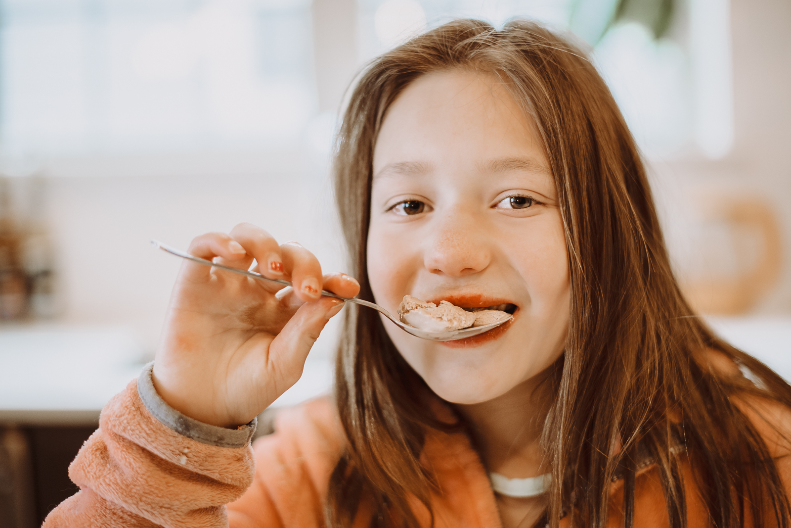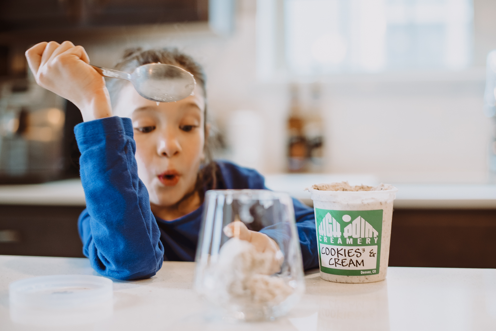 Product Photography | Girl scoops out milk chocolate from ice cream from pint cup | High Point Creamery, Denver, Colorado