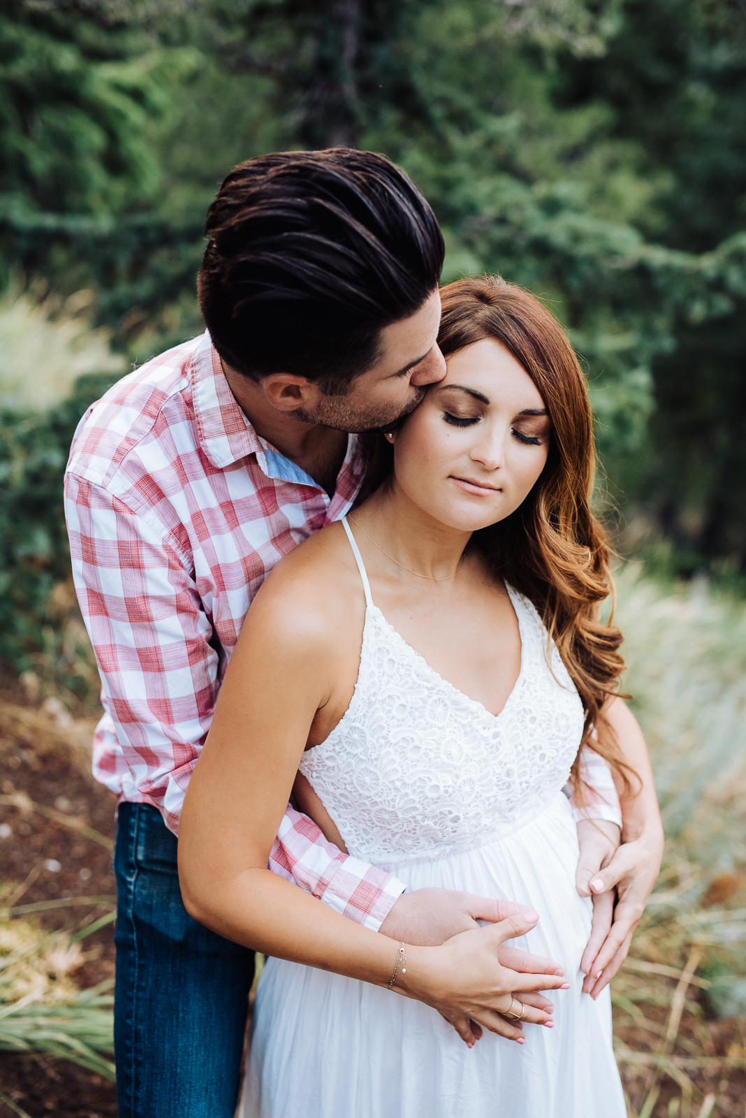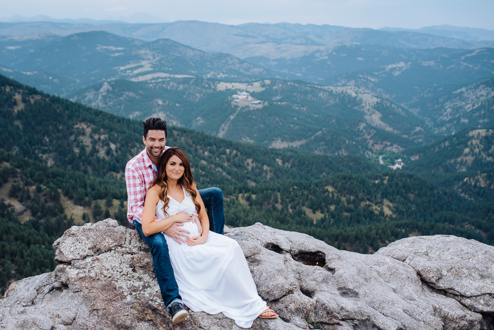 While there is a lot on the worldwide web on what to wear as a pregnant mother, Alexandra chose a perfect outfit for a mom-to-be. A long, flowy dress not only made a beautiful mountain-top look, but it’s comfortable! Light caught her white dress just right, and holding that belly bump looks great when you’re wearing loose fabric. While Noam does not have to worry about what shirt looks right with his baby bump, his checkered button down and jeans contrasted her colors really well!
