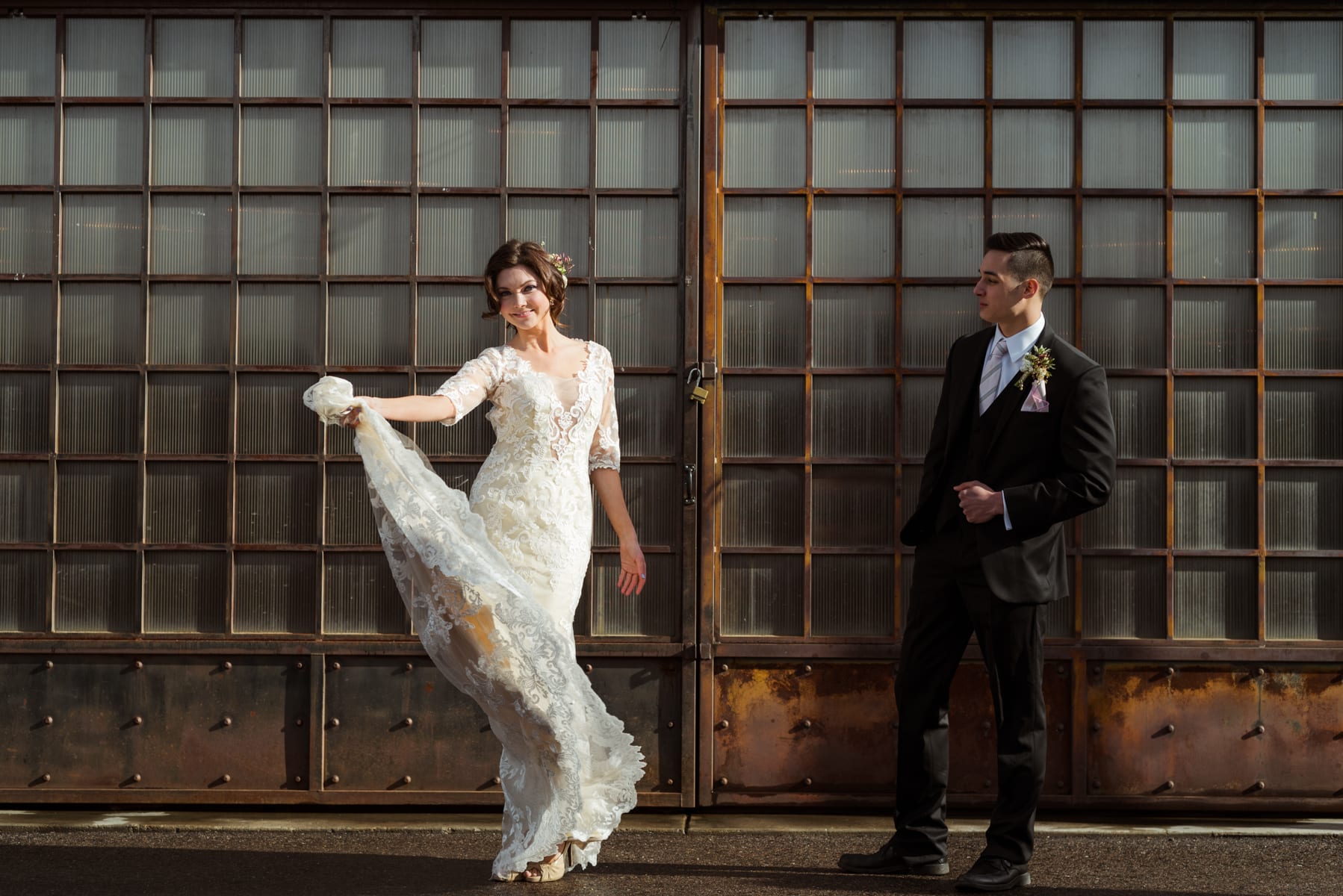 Picture an urban setting with a rustic barn right outside. We’re not kidding, the space actually has a barn! The versatility of the venue allowed for a wide variety of looks. This location truly is the best of both worlds! Andrea and Tanner, our rockstar models, flaunted everything from jeans and T-shirts to full on wedding wear. They made our Blanc fashion photography session a breeze.