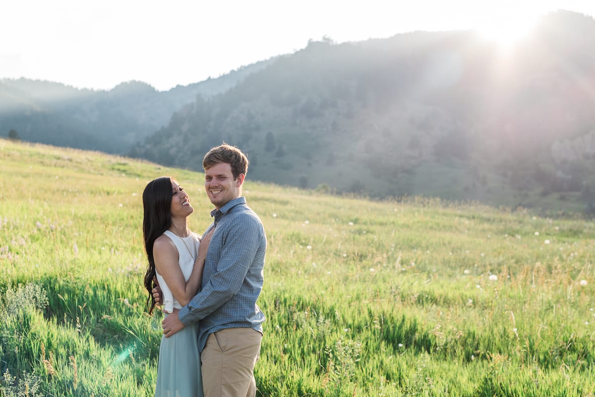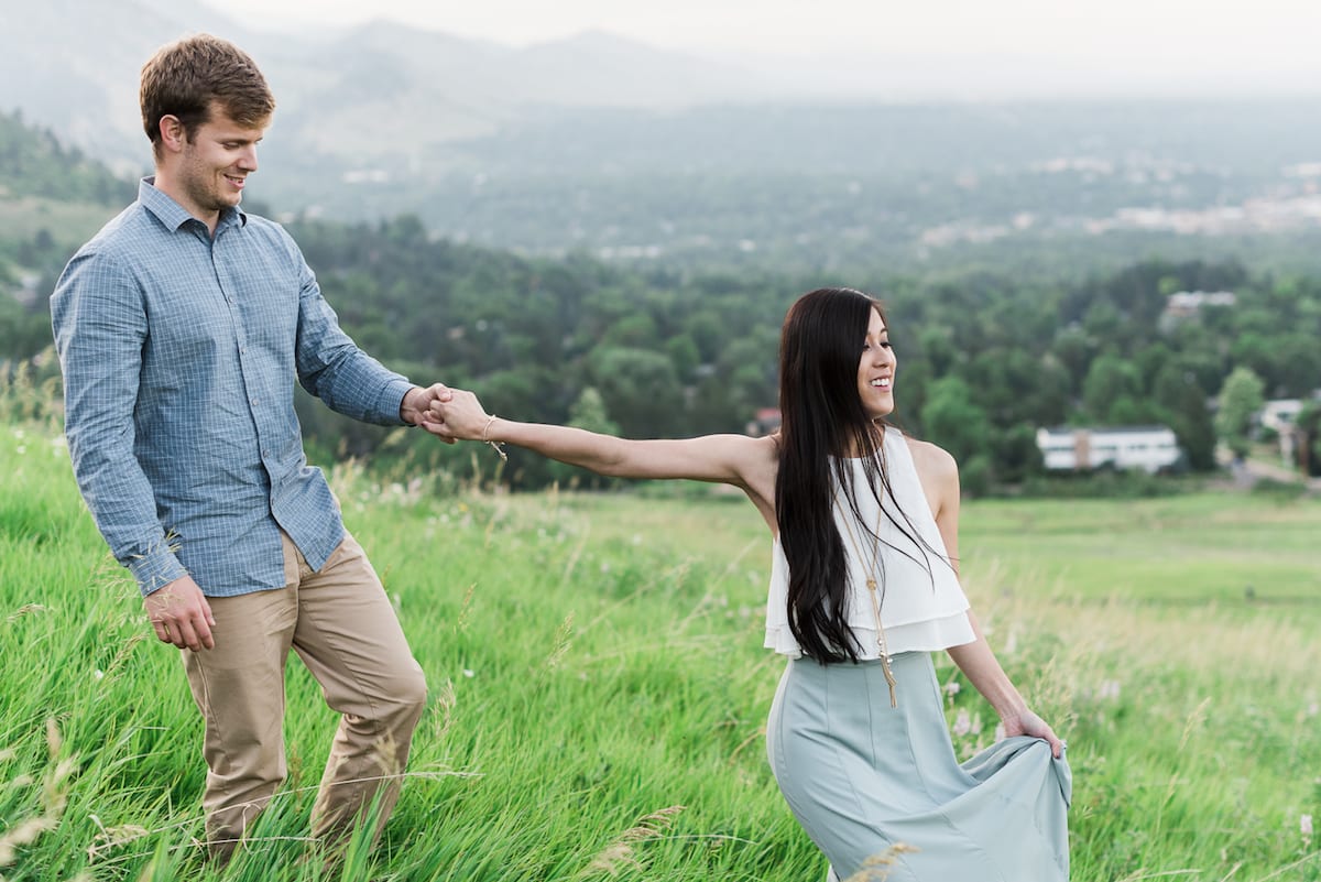 Heather wore a powder blue maxi skirt with an ivory blouse and, of course, those tan heels that had Norris carrying her up the hill. Her gold jewelry was the perfect finishing touch. Heather’s outfit complimented Norris’ khaki pants and blue striped collared shirt. These two fit perfectly in the mountains giving us the ultimate fairytale vibe.