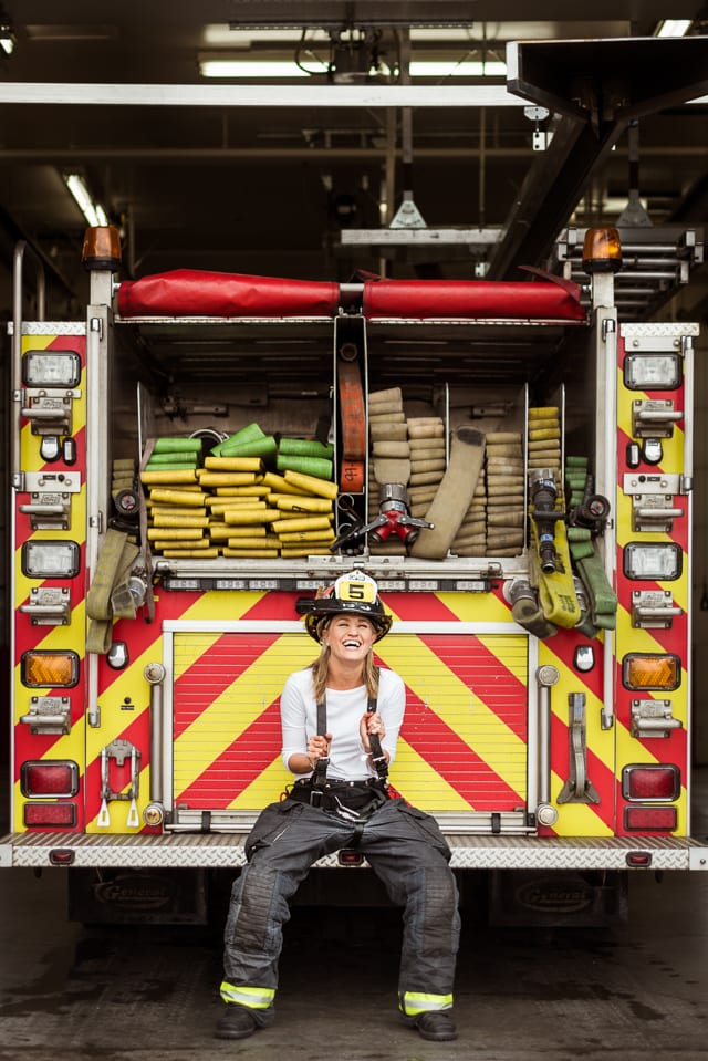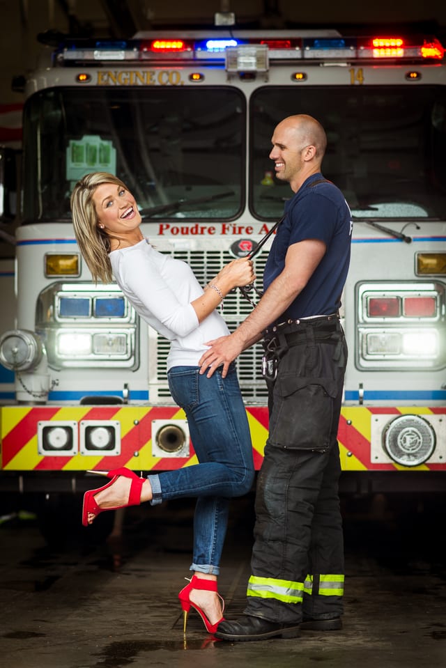 Chris is a firefighter in Fort Collins, where these fun photos were taken, and Kelly is a local CBS4 news anchor. They’re kind of a local power couple! They decided to take their photos in the firehouse, a setting that is just as meaningful as it is adorable.