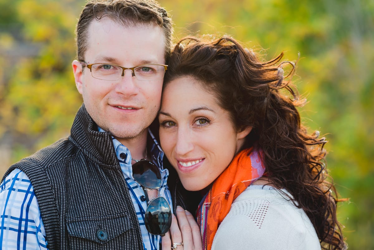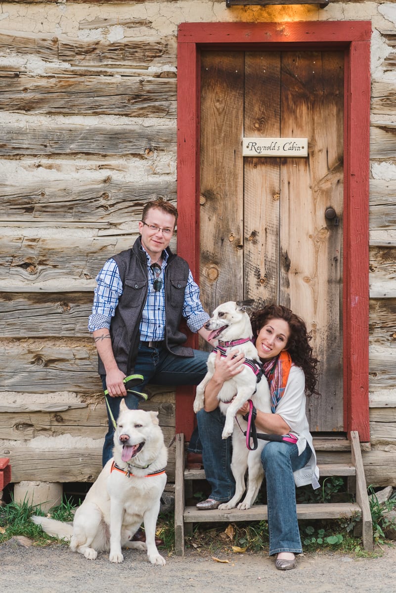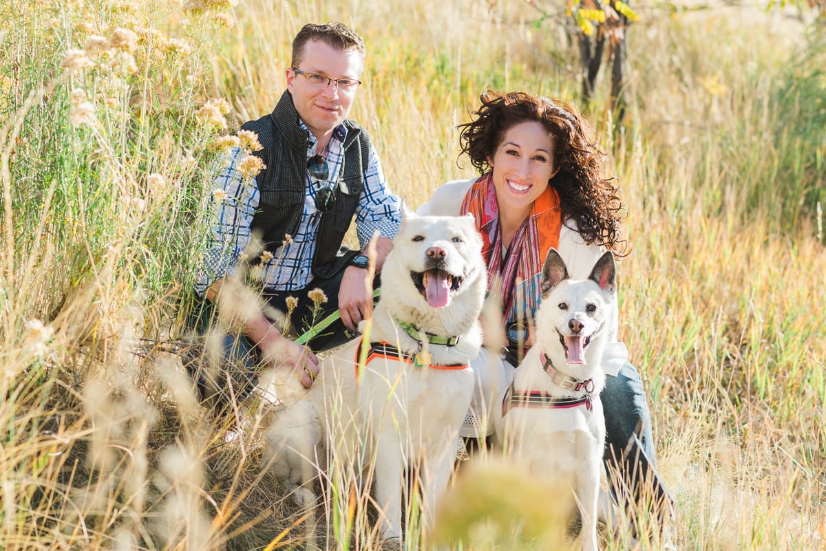 It might be because we live in #BroncosCountry, but Alana’s orange scarf and Erick’s blue plaid button down paired perfectly together! And being dog lovers, Alana and Erick brought their lovable pets along for the photo fun. We’re not too sure if it was on purpose or not, but their harnesses matched Alana’s scarf, which made the colors pop even more. Their coordinating outfits and the autumn foliage made for a perfect family photo! (For more furry friend photo inspiration, check out our Pinterest board full of pet-friendly photo ideas.)