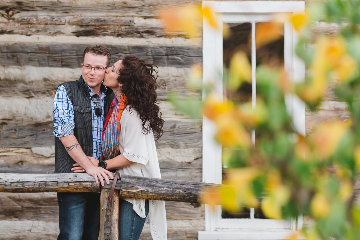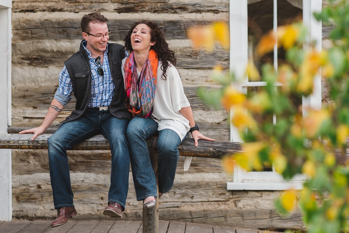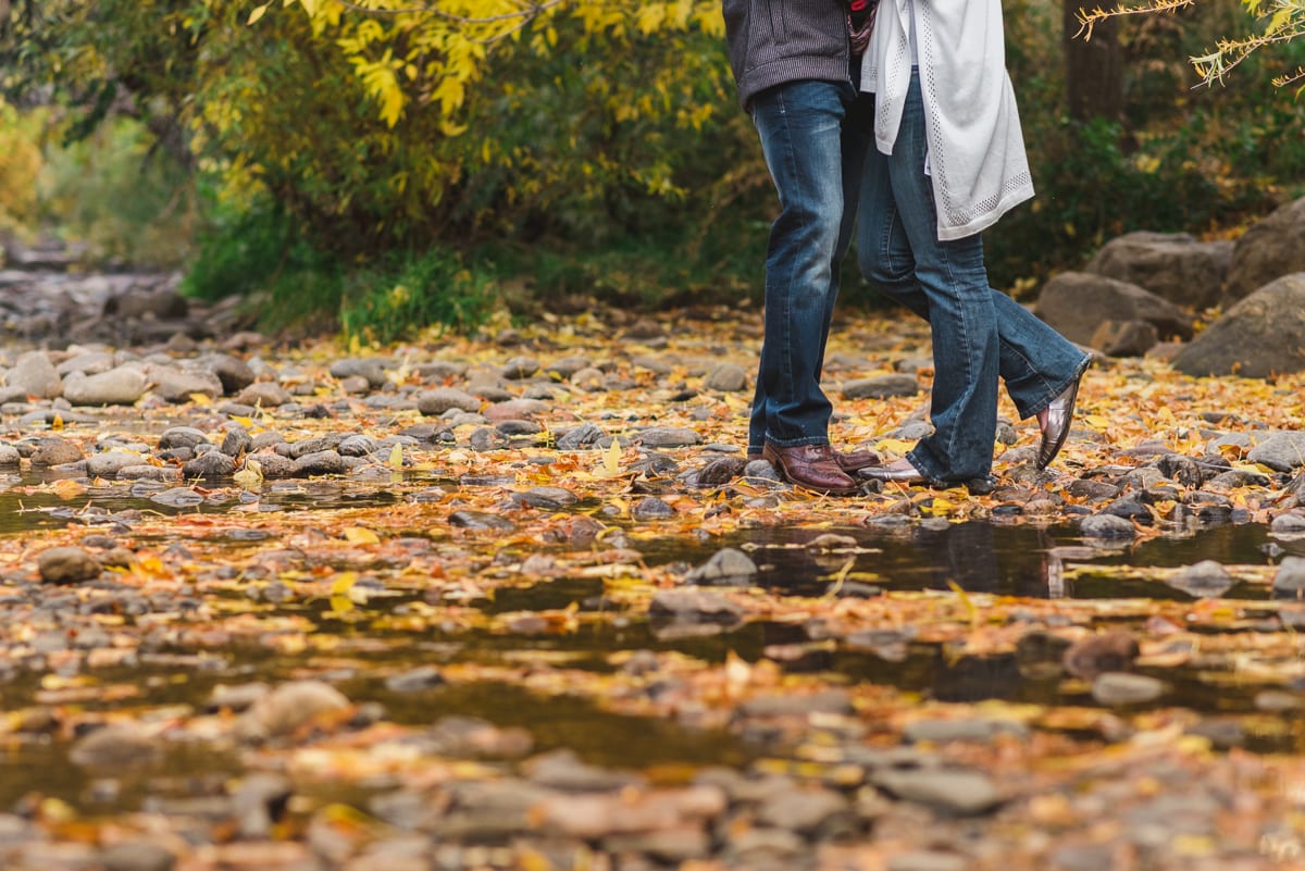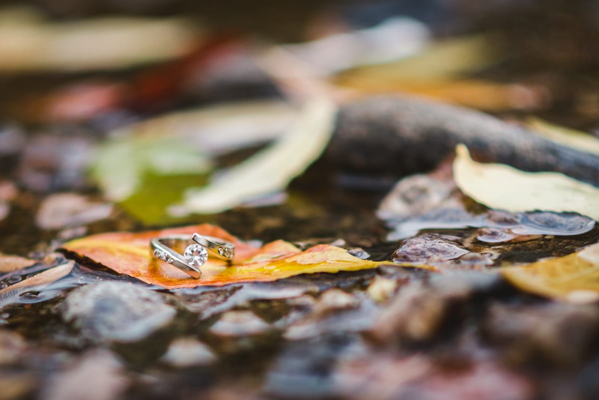With fall in full transition, the oranges, yellows, browns, and fading greens gave us a great backdrop. The texture on the rustic wooden cabin mingled with changing leaves, drawing more attention to the beautiful couple! Leaves are always fun to jump in, but they’re even more fun to take Clear Creek engagement photos in. By the way, leaves can double as a mini-platform to pose an engagement ring–just look at that beautifully unique ring!
