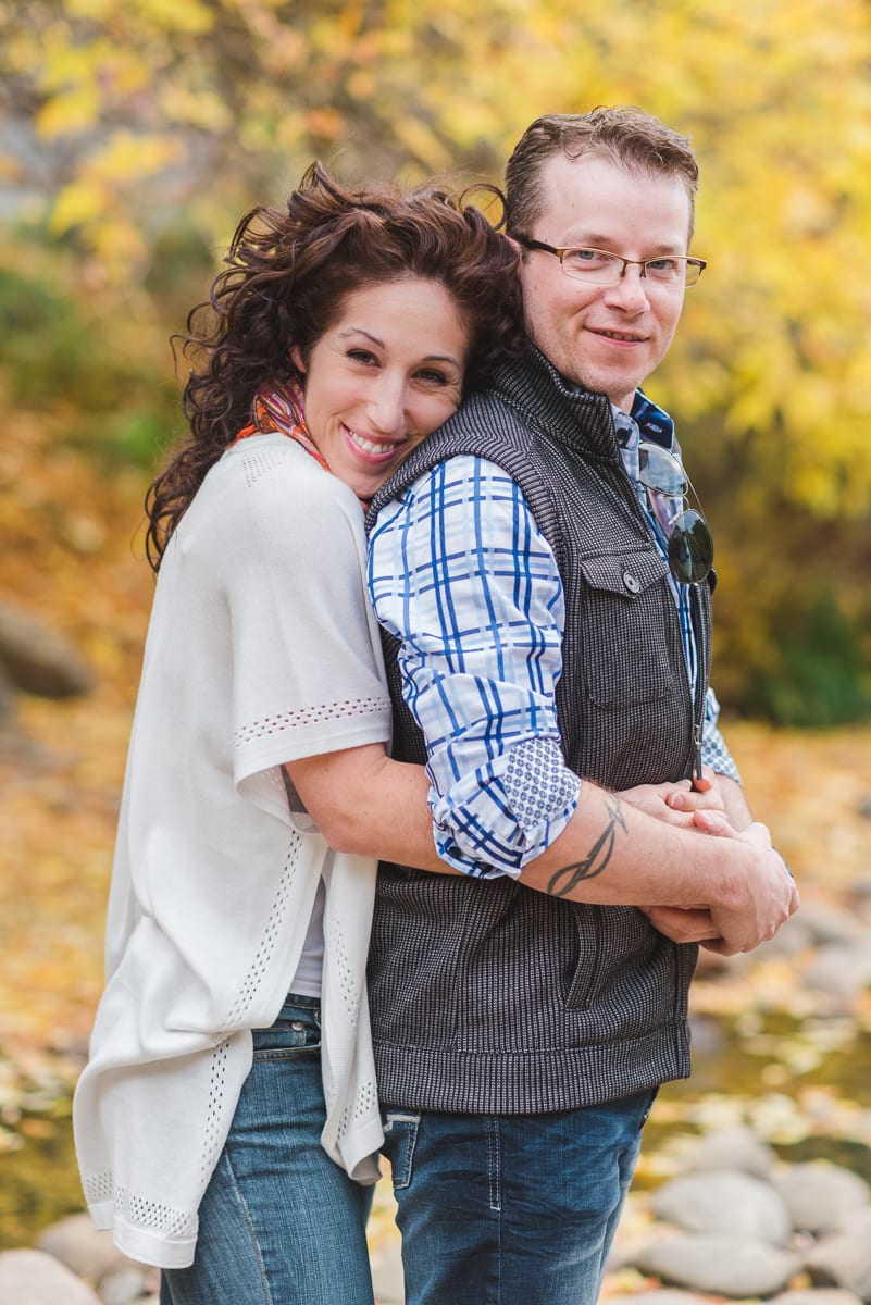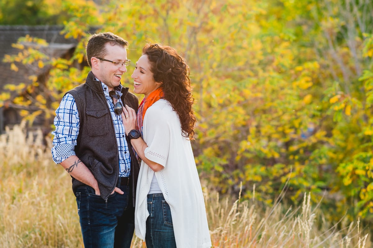 Experiencing the change of seasons in Colorado is always a pleasure, but autumn has a unique splendor and energy! The bright fall light bounces off the warm colors well, giving everything a toasty glow. It makes this adorable couple look particularly cozy, that’s for certain! We spent a gorgeous fall afternoon with Alana, Erick, and their two friendly pups in Golden, Colorado taking their Clear Creek engagement photos.