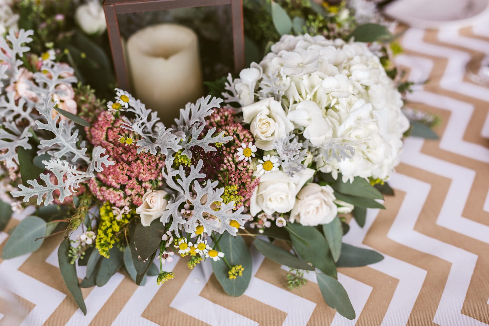 Elegant table setting and floral centerpiece inside a Devil's Thumb Ranch wedding reception space