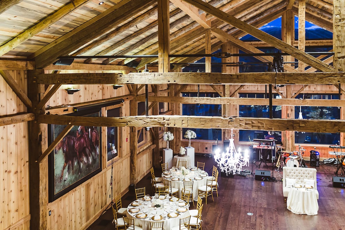 For couples who want wide-open spaces and dramatic views, the Broad Axe Barn delivers. This spacious venue features soaring ceilings, exposed timber beams, and panoramic windows that showcase breathtaking views of the Continental Divide. It’s one of the most photographed wedding spaces in Colorado — and once you see it in person, you’ll understand why.