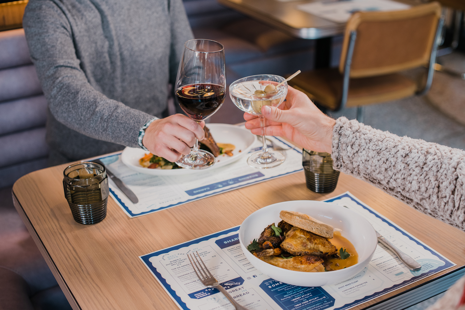 Colorado Hotel & Food Photography | The Original, The Rally Hotel | Woman and man enjoy meal with alcoholic beverages
