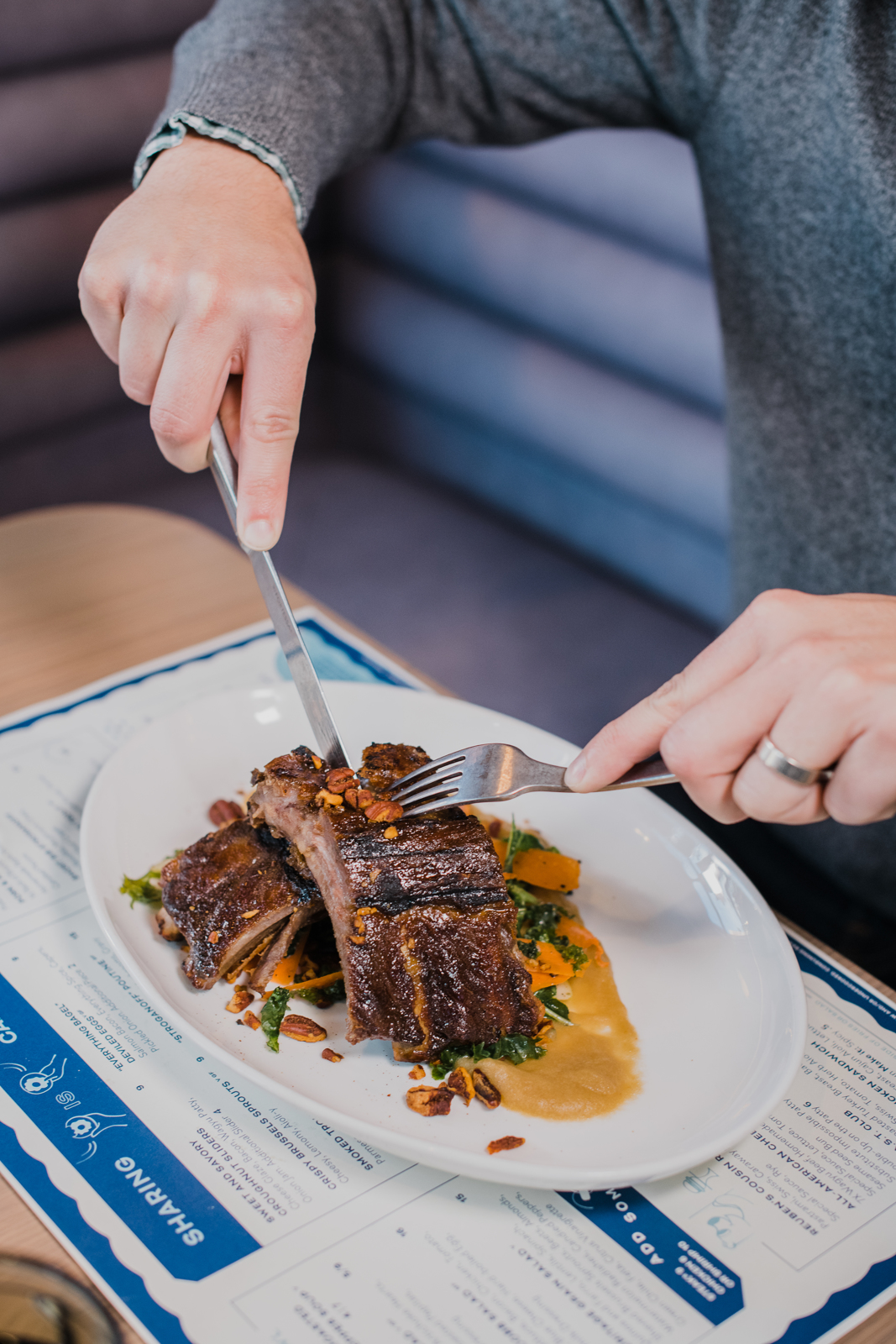 Colorado Hotel & Food Photography | The Original, The Rally Hotel | Close up on ribs with wine glasses in the background