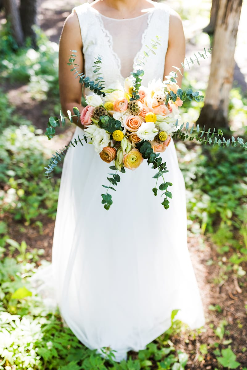 First of all, Amy’s dress stood out beautifully against the green Conifer backdrops. With a stunning beaded sash around her waist and powder blue heels, she couldn’t have tied together her vintage bridal look any more gorgeously. Luke’s blue suit perfectly complimented her dress, making them a picture-perfect couple. Plus they earn bonus points for both checking the “something blue” box on the wedding list of must-haves! Pops of orange, pink, and coral were an amazing color combination to make their wedding stand out.