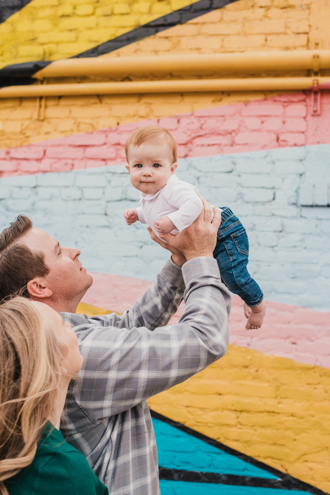 The key to successful RiNo family photography is understanding how different murals work with different skin tones, clothing choices, and family dynamics. Bright, saturated color walls work beautifully as energetic backdrops but can overwhelm the subjects if positioning isn’t perfect. More muted or abstract murals provide interesting texture and visual interest without competing with the family. We strategically chose a variety of backgrounds during Heather, Josh, and Olive’s session to create diversity in their gallery while maintaining cohesive storytelling.