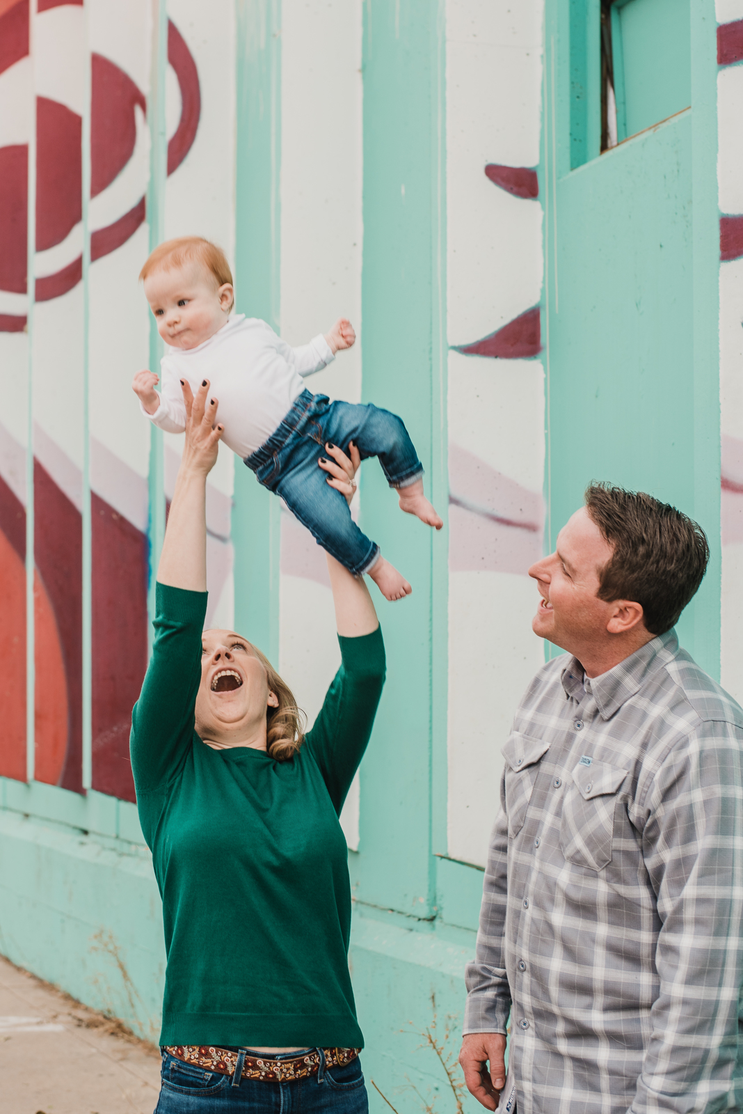 Colorful urban family photos capturing genuine family moment in RiNo Art District