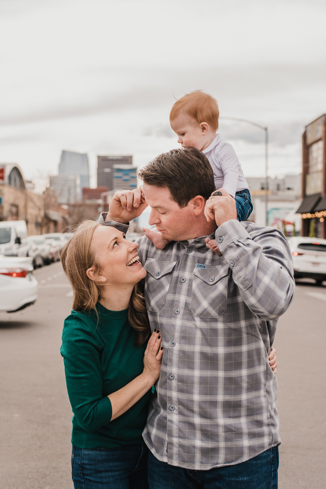 Smiling baby outdoors with happy parents during urban RiNo Art District family portrait session