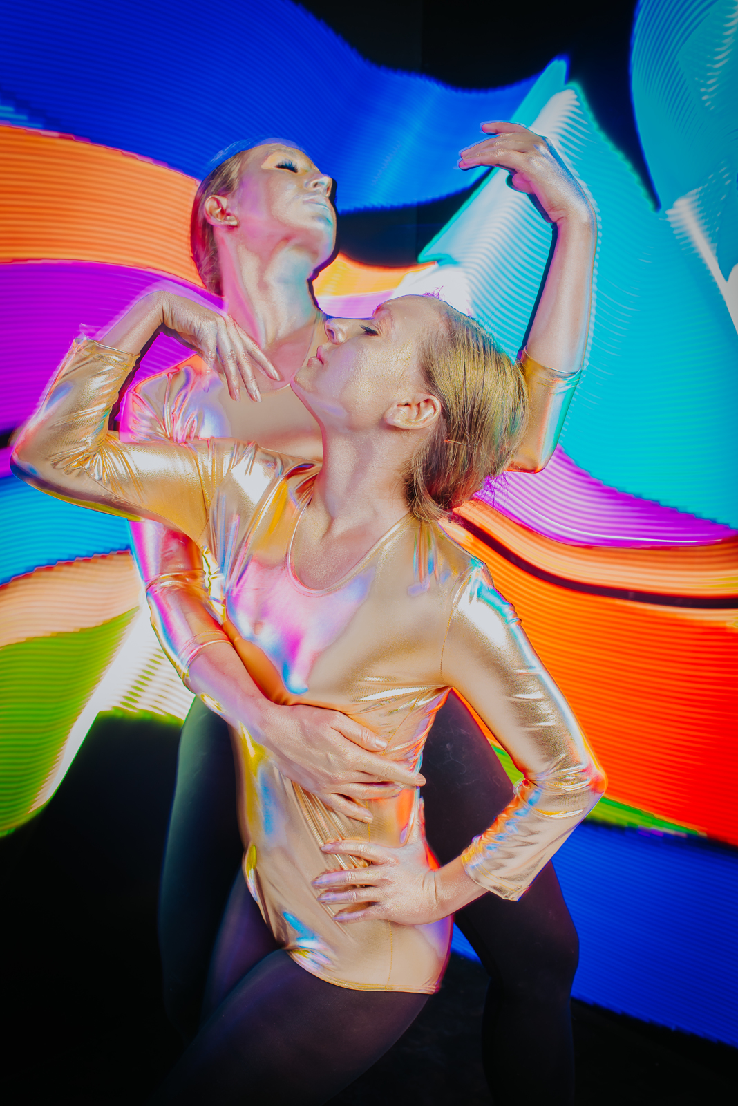 We have extensive knowledge in studio lighting. For this shoot we used gel lights to create the colorful shadows above. Additionally, we used long exposure light painting to create the red wavy lights you see below. We also painted a gold backdrop to cater to the theme: James Bond Goldfinger. We love getting to creative to bring client’s visions to life.