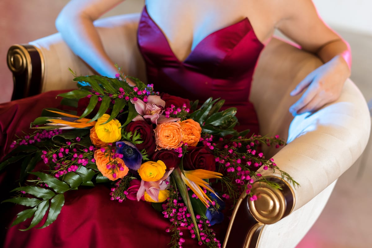 If anyone ever said pictures can’t be taken in front of a yellow wall… then they are wrong! Taylor and Nick slayed that yellow wall. Taylor’s gorgeous red dress with hints of a deep purple popped in front of the accent wall. The juniper greens, magentas, oranges, and marigolds of Taylor’s bouquet and Nick’s boutonnière paired brilliantly with the yellow wall, red dress, and black tux.
