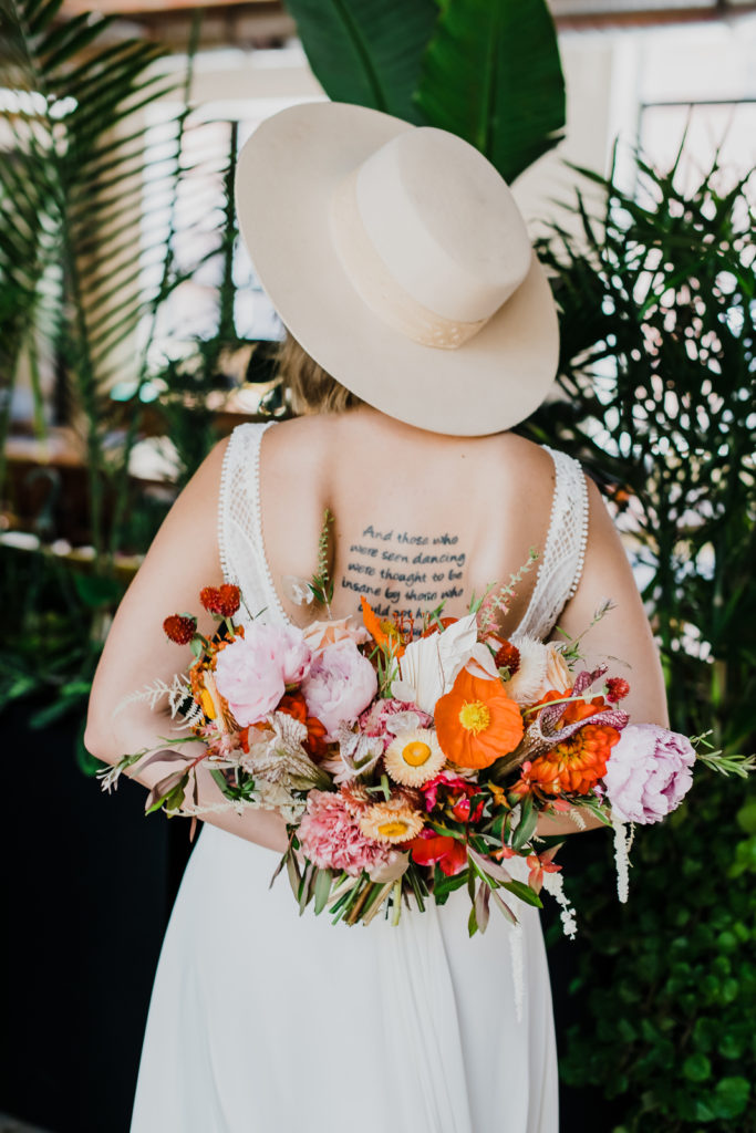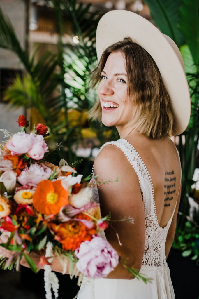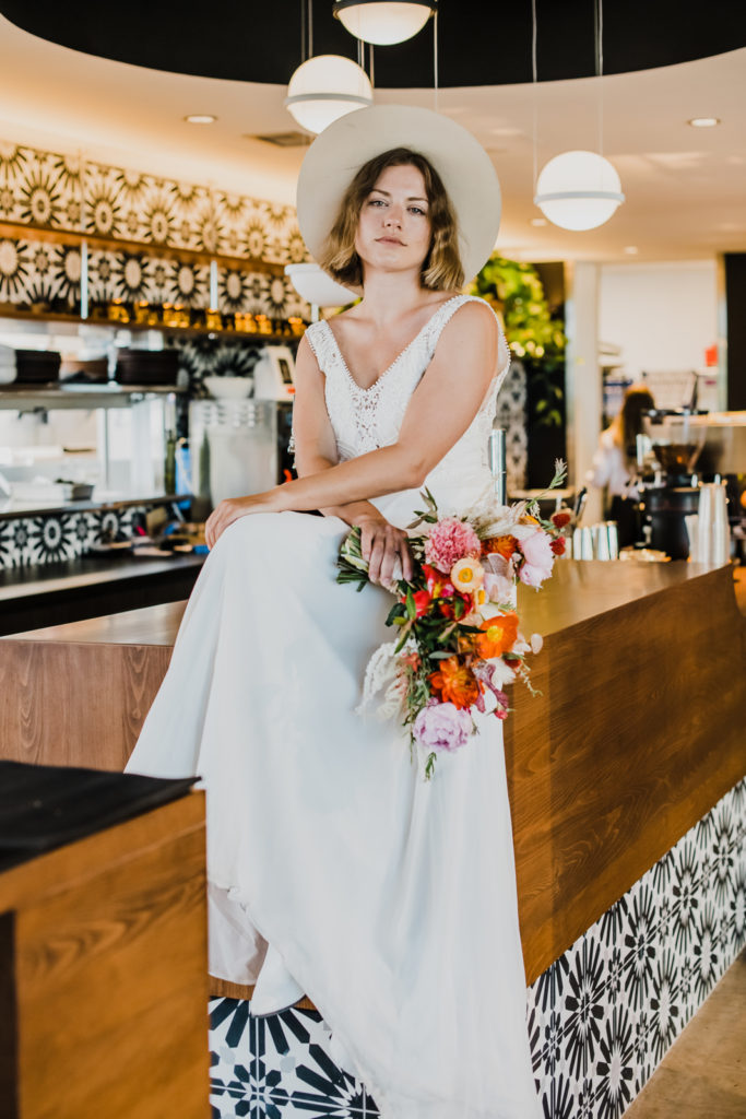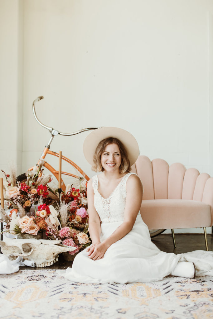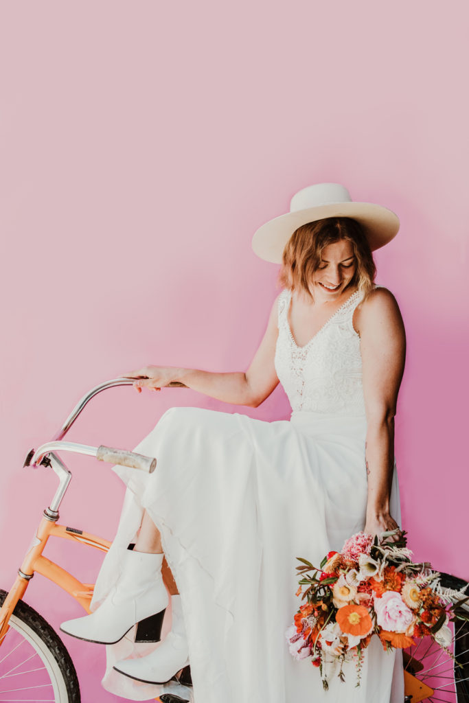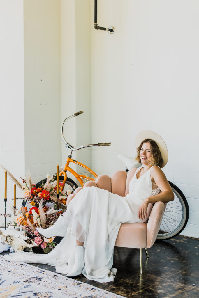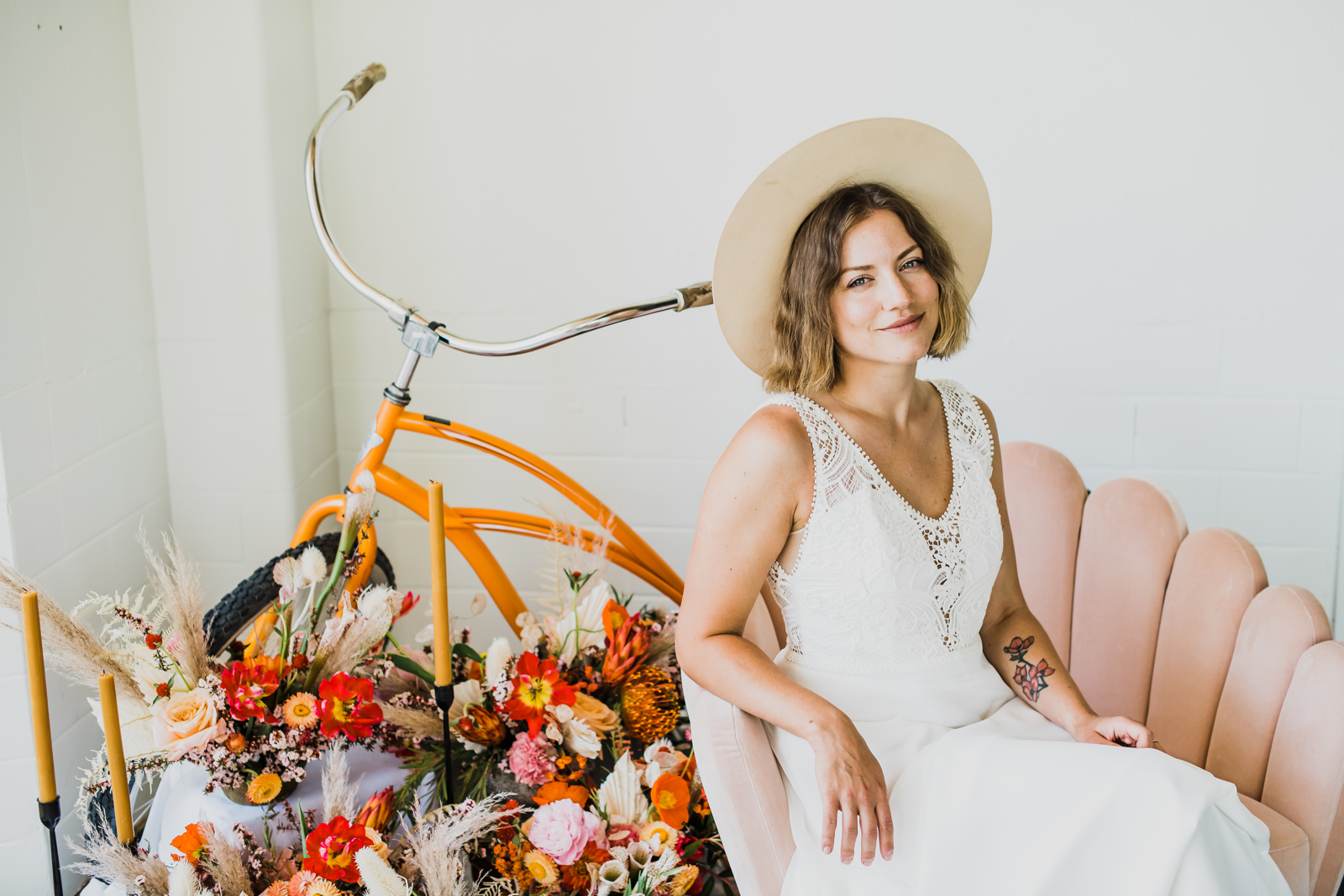 The classic beach cruiser made for an amazing accessory to add some serious summer vibes to this beautiful boho bride’s look! The color coincidentally matched with the flowers from The Olive and Poppy! The white brick wall and decor provided by Territory West Designs gave us a seriously romantic and fun vibe at the new Denver venue Nurture offering wellness, weddings, and more!