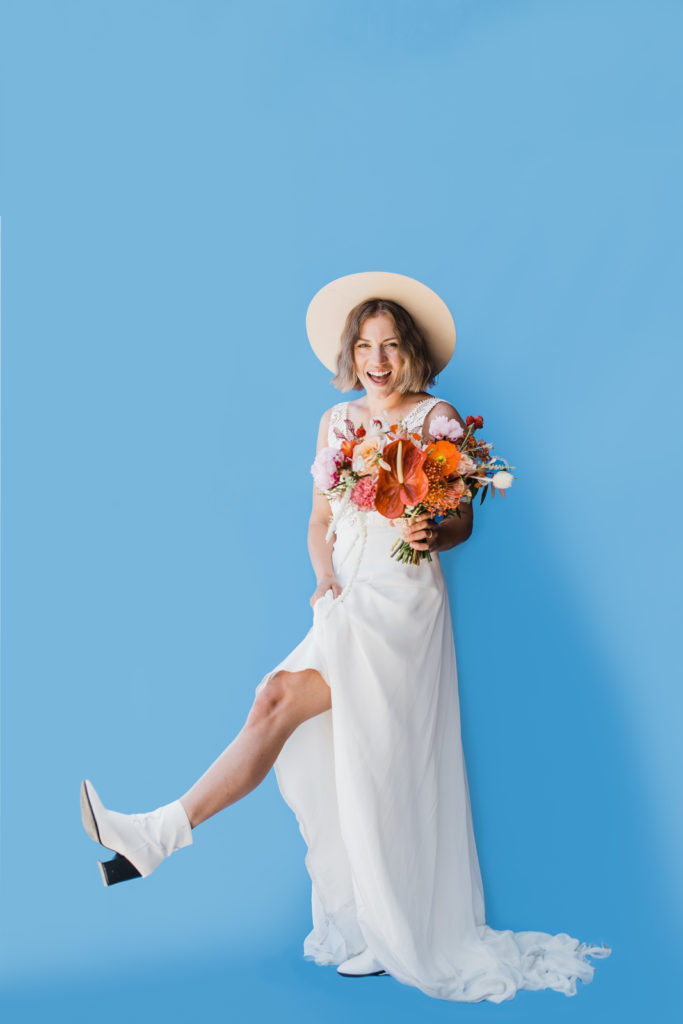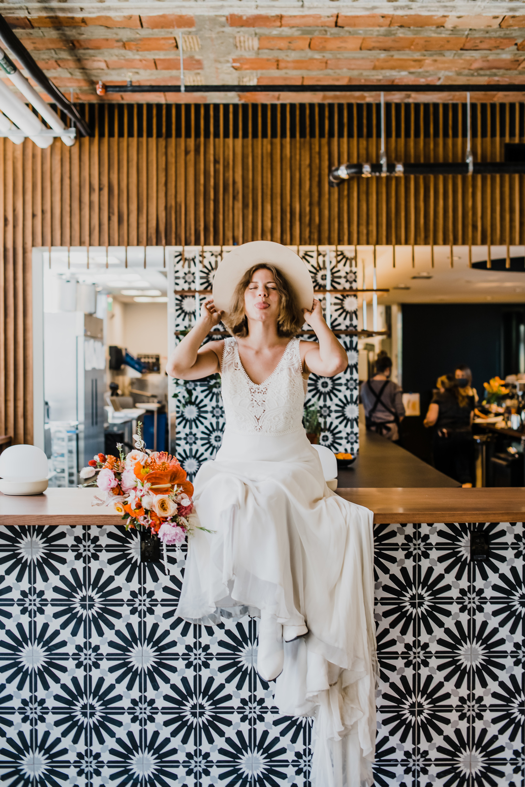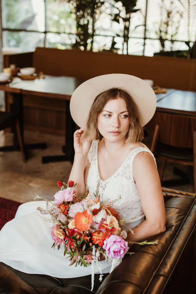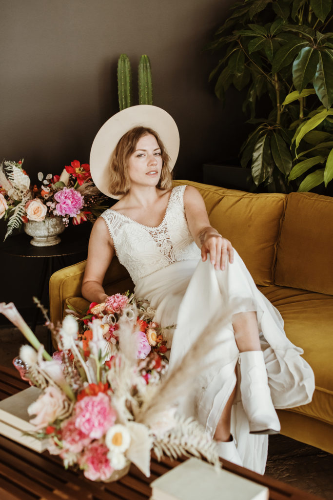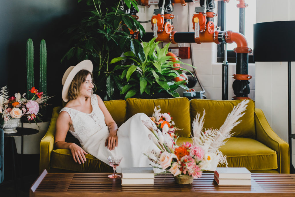 The contrast of the white dress, the hat, and shoes (yes those are white ankle boots!) with the black wall and other minimalist decor makes our bride pop! We love the elegant, sultry romantic vibes we’re feeling here.