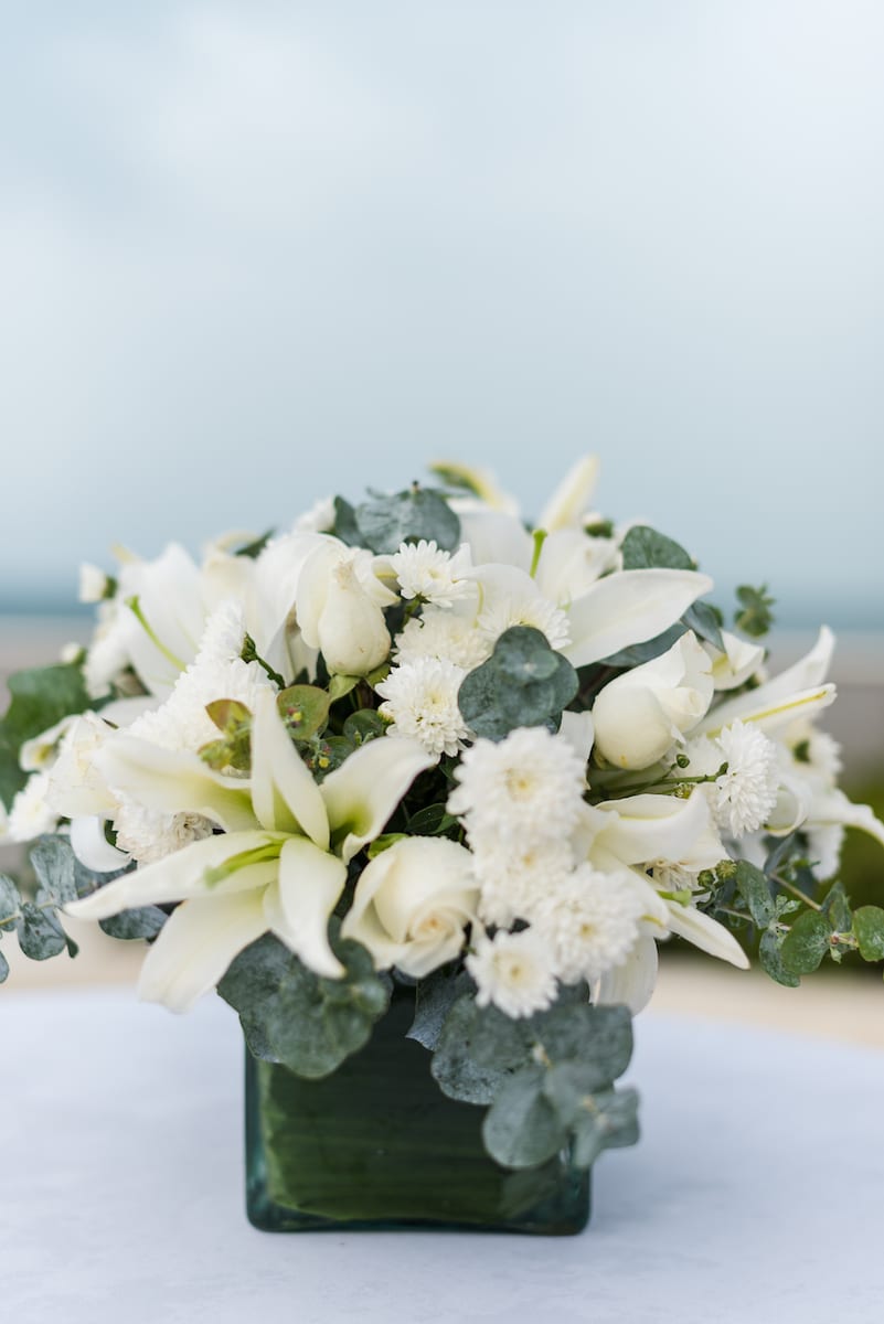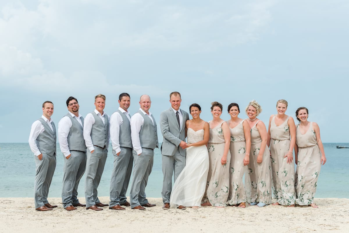 The color scheme was also greatly inspired by the venue, with a gorgeous ivory chosen for the bridesmaids’ dresses–reminiscent of the pristine sands of Cancún. The groomsmen donned a soft blue-grey that wonderfully matched the colors of the sea and sky on the island horizon.