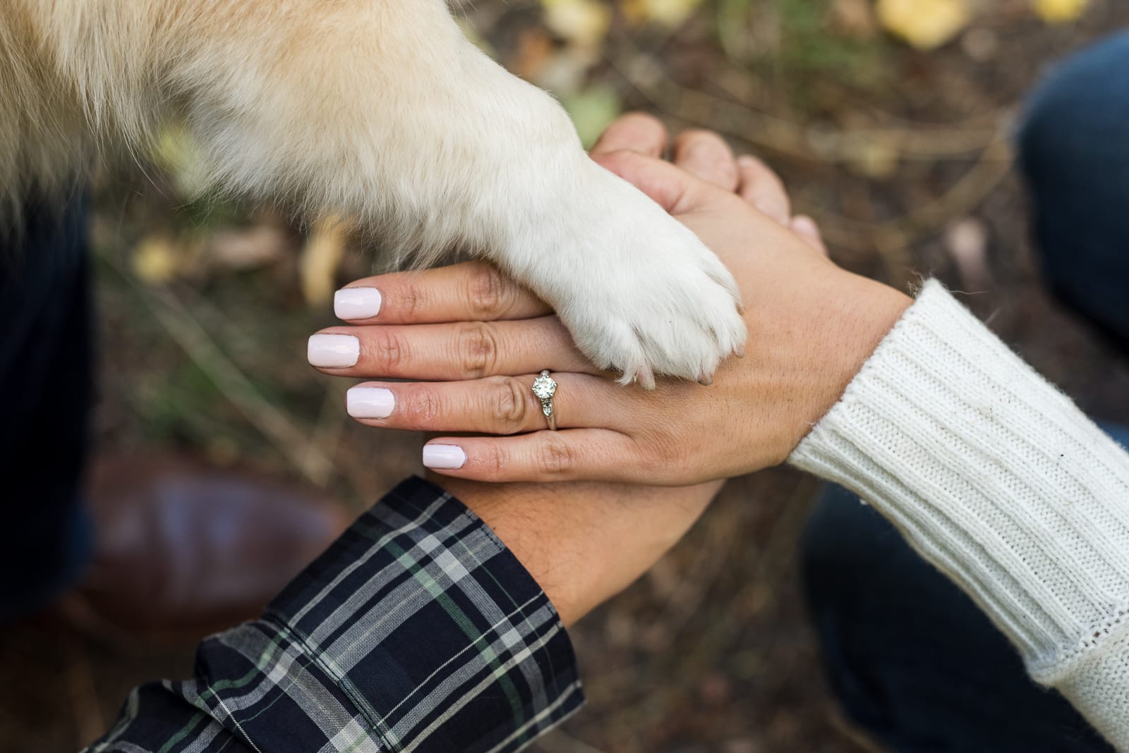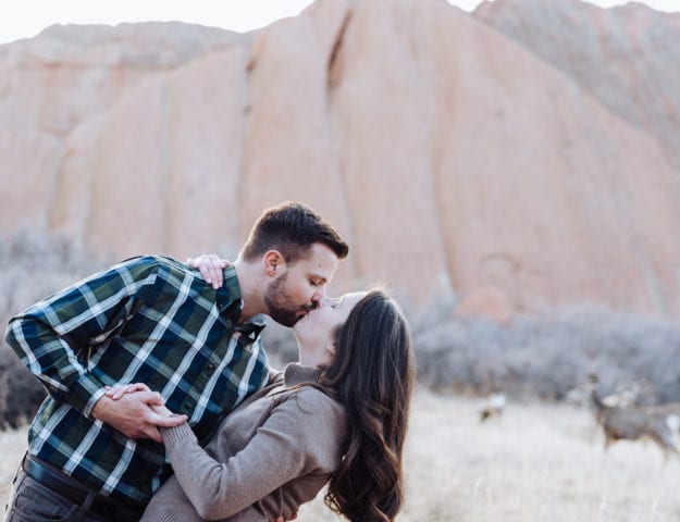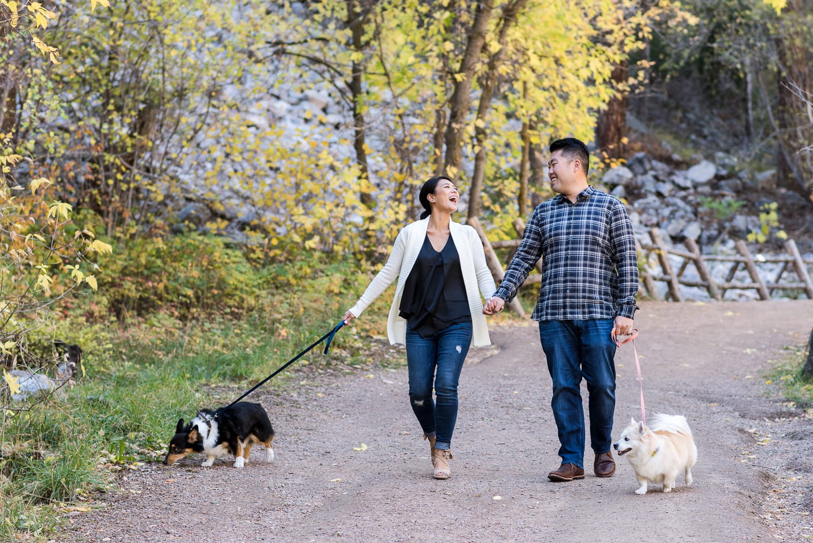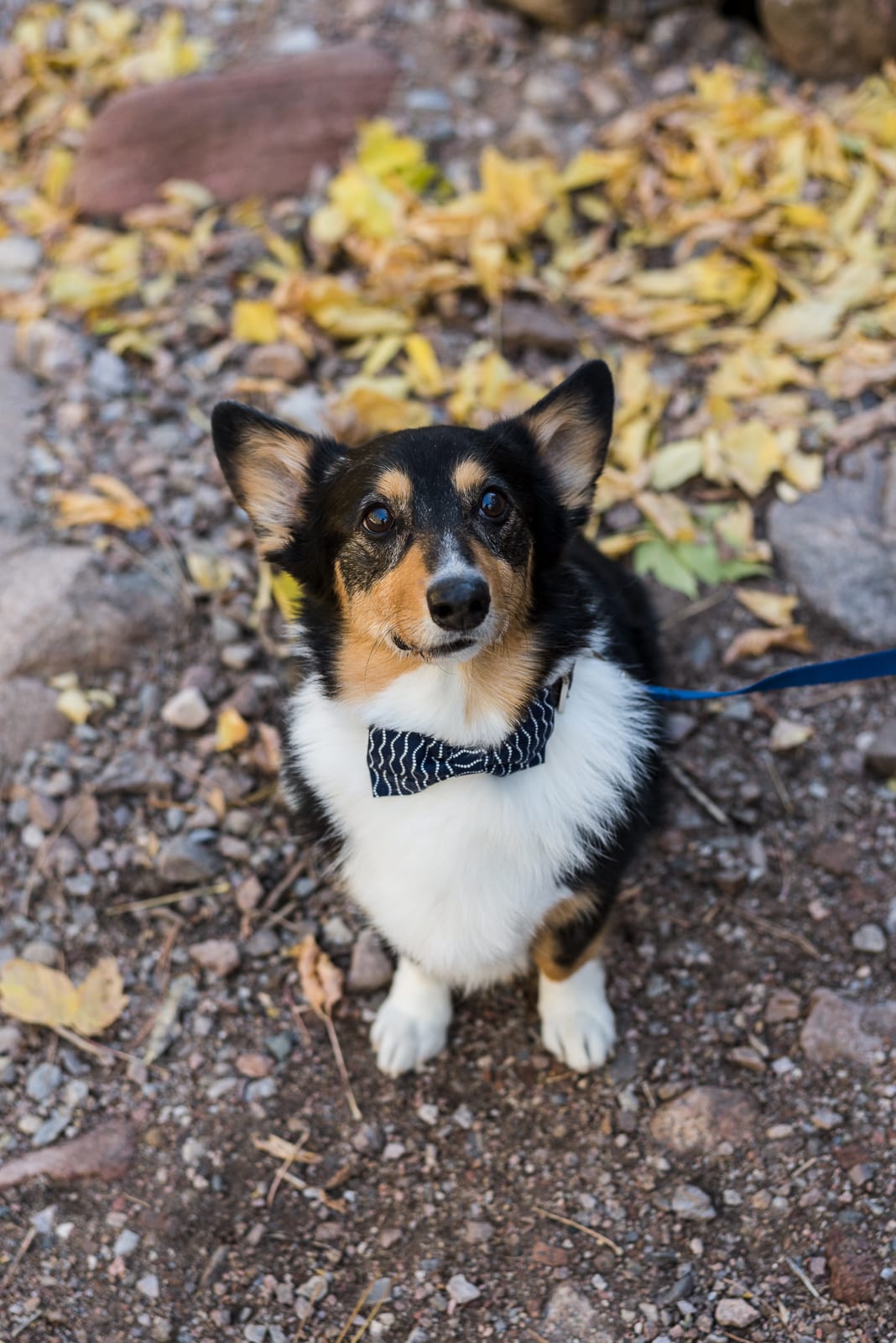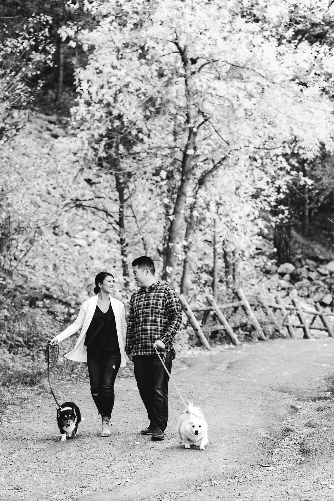 It was a perfect fall day for taking a walk outside, and that’s exactly what Julia & Travis did. With their walking buddies on leashes and ready to go, there couldn’t have been a better opportunity for candid photos of the couple. Julia & Travis looked great from head to toe, and so did their pups! One of their furry friends even wore a bow tie for his photo op!