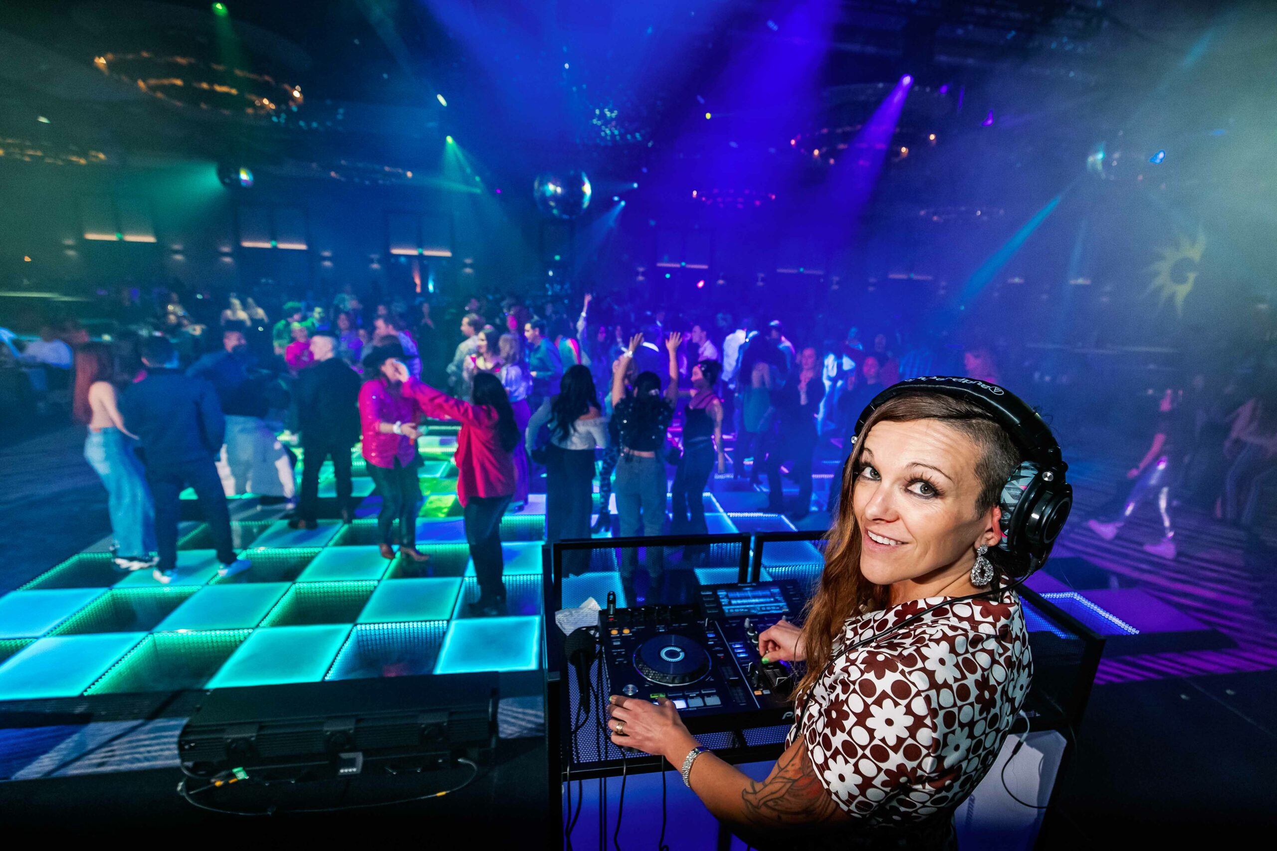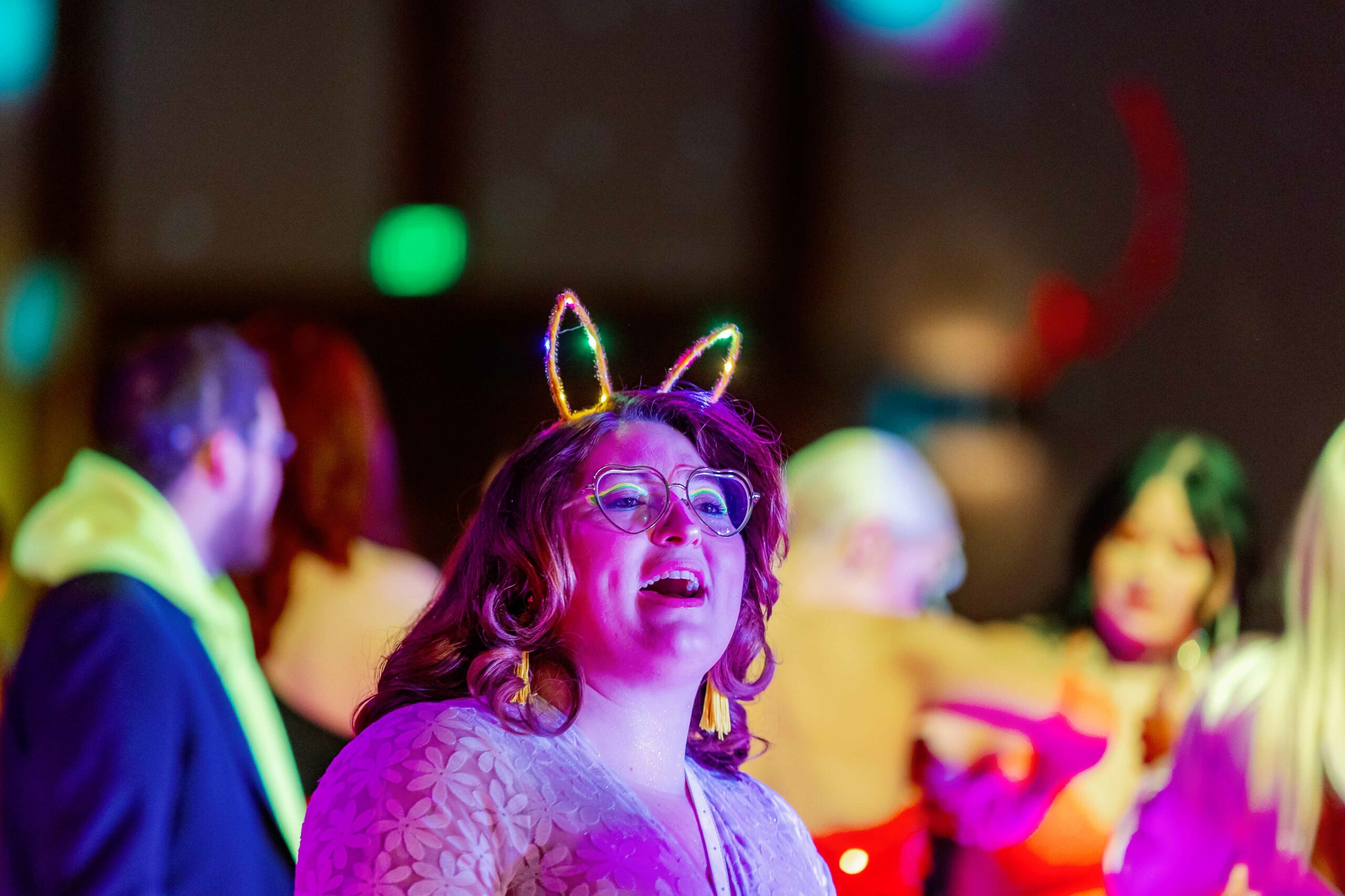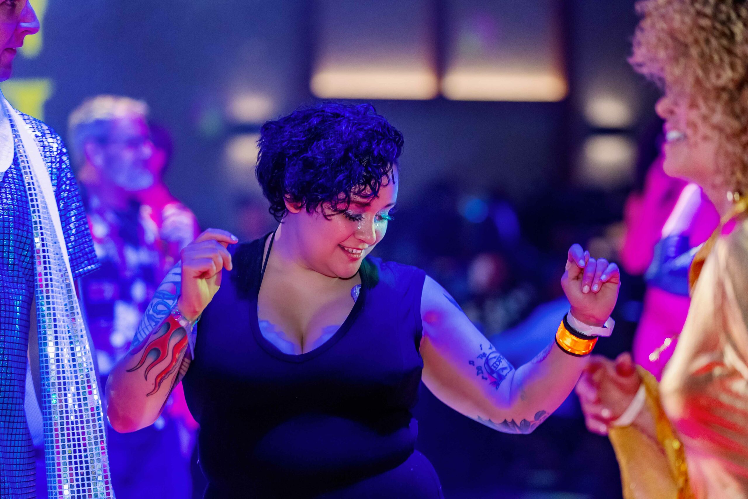 Okay, back to photographing this colorful corporate party at the Gaylord. Since it was disco themed, they had every color imaginable flashing on the walls, floors, under the floors… it was intense, in the best way possible It could have been a Pride event with every color of the rainbow on such proud display! The dance floor was pretty cool as well: it utilized a mirror trick that made it look like you could fall downward infinitely. Then there were the themed roller skaters, who grooved around the guests as they glided across the spacce.