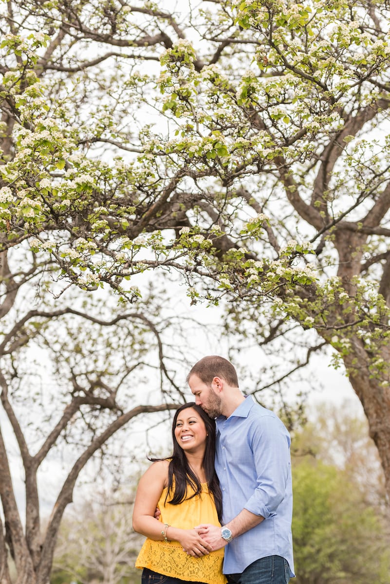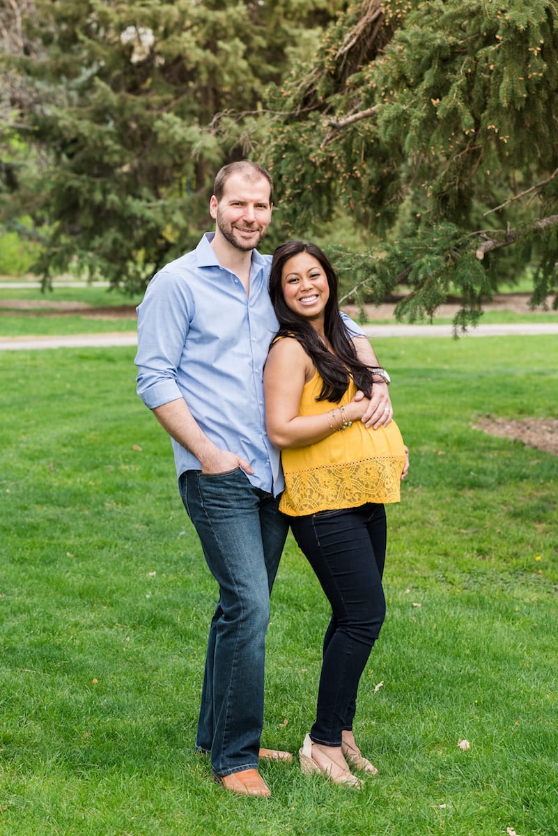 Well, celebrate we did, when we found out this lovely couple was planning for a baby girl! Ecstatic to do the maternity photos, our photographer had a blast with this pair. A gorgeous outdoor setting, a perfect spring day, and a happy couple- does it get much better? Hijschen & Rob picked out casual, yet trendy spring outfits. With soft colors that popped from the green background, the two stood out beautifully from the flowers. The pastel blue and bright yellow shirts definitely say “baby on the way” and we love the symbolism behind incorporating small leaves and flowers.