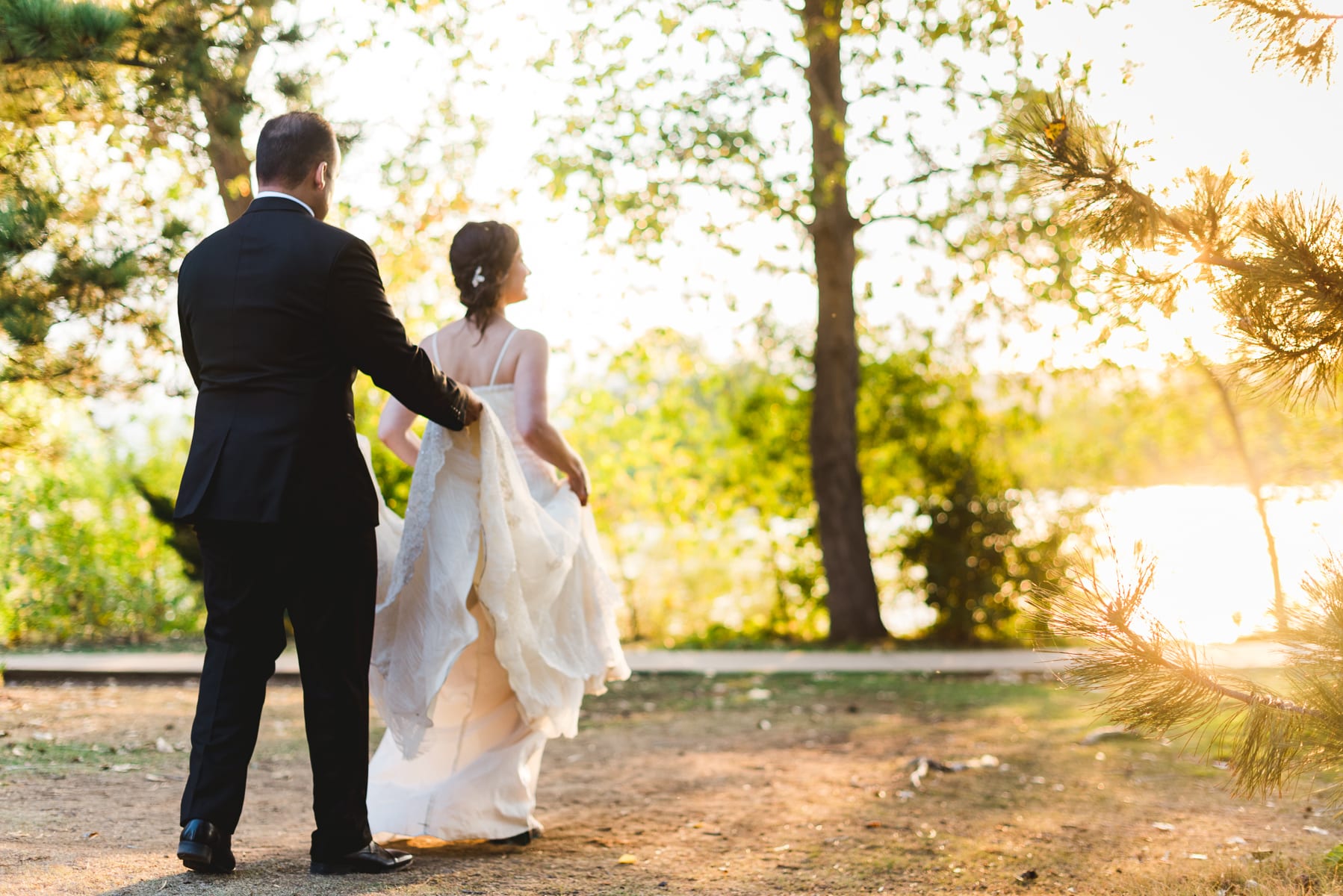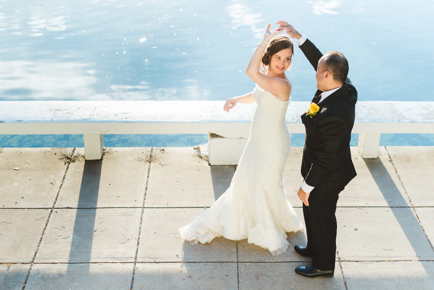 We timed their photos perfectly because we caught the gorgeous sunset at Belmar Lake! Hand holding on the boardwalk, walks around the banks, and whispered sweet nothings were in abundance. Lee looked absolutely radiant in her white wedding gown as she danced with Cesar by the lakeshore. Wedding dress twirls paired with the sun setting on the lake really made for some magical wedding photos! Swoon!