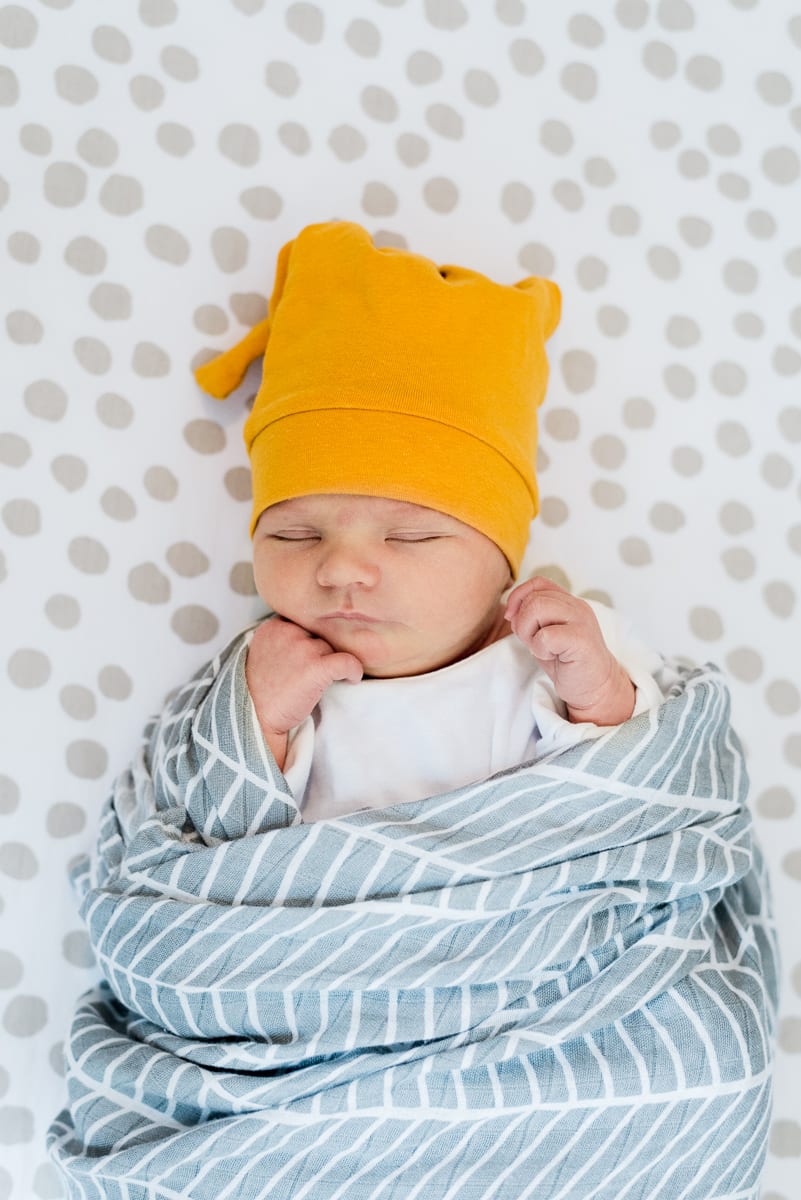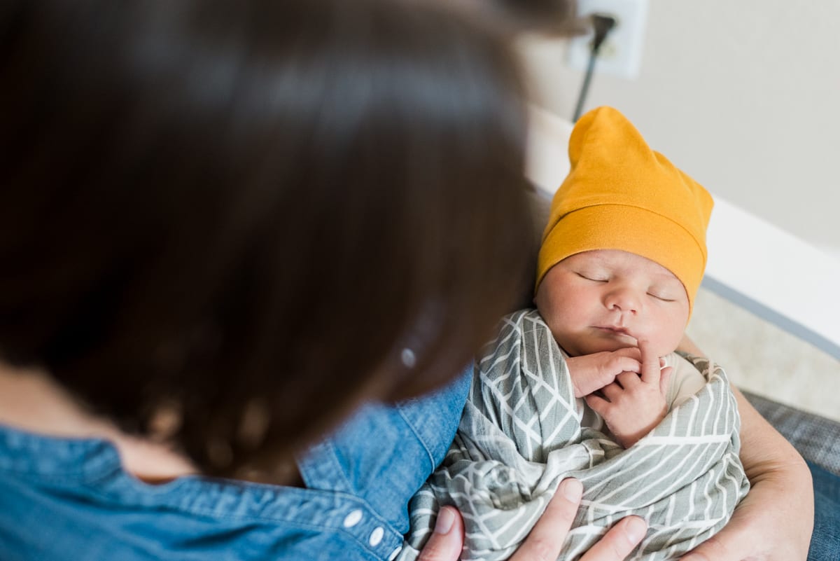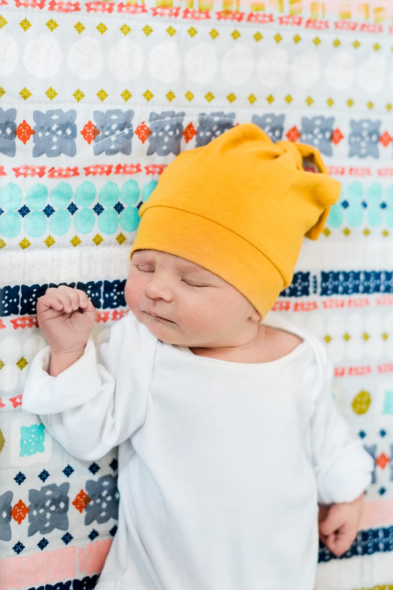 Two Mommies and Their Baby | Newborn Photography | From The Hip PhotoThe new mom’s outfits went so well with the simple yet modern feel of the baby’s nursery. All the colors worked so well together. We especially loved the pop of color one of the newborn’s hat gave the images. The canary yellow was like sunshine against the white a tan spotted crib bedding. )Plus we’re sort of curious if they make such a hat in adult sizes!) Check out one of our Pinterest boards for newborn outfit ideas for these types of sessions.