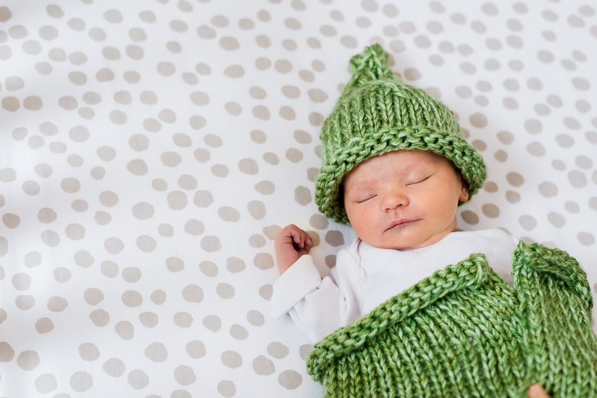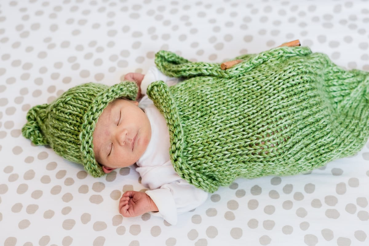 Their session took place the day after Halloween, so you know know we had to snap some shots of their newborn dressed for the holiday. She was… a string bean! We were lucky enough to get a picture of her in the darling knitted costume which consisted of a green sleeping bag-like blanket with a toggle fastener, plus a matching hat. The knitted attire was a very adorable change up from a typical string bean baby costume. We realized by the end of the shoot that this little girl looks way cuter in hats than we do!