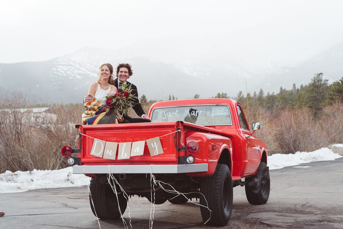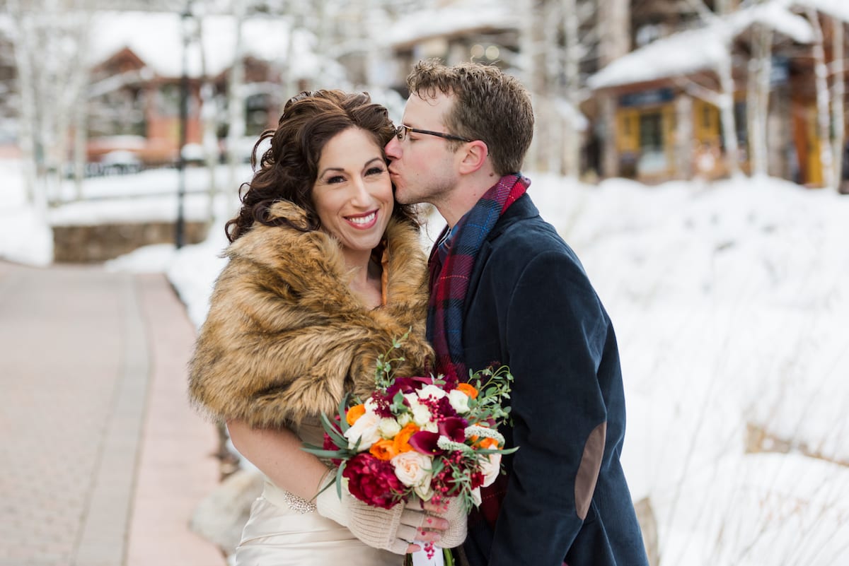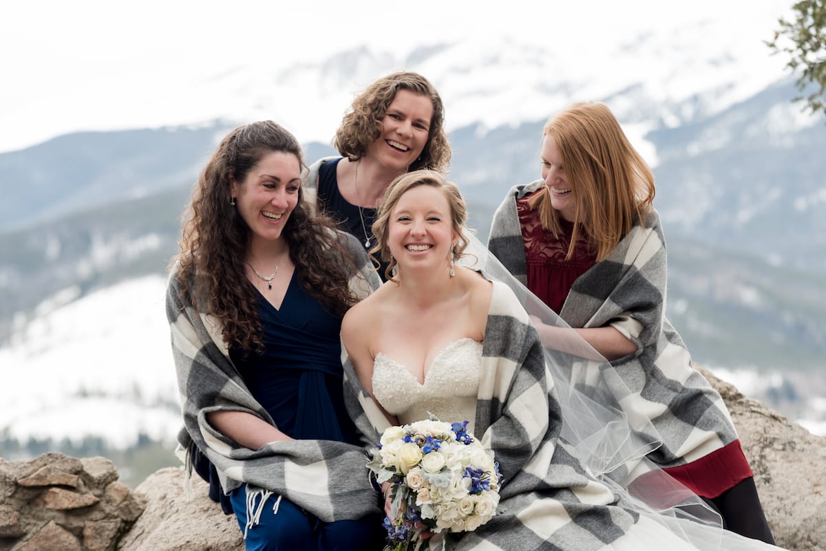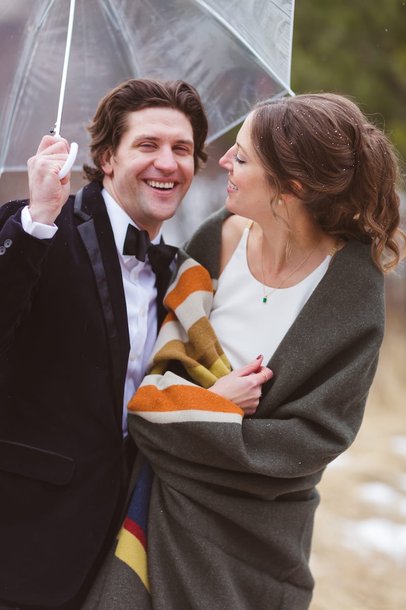 Naturally, some brides won’t want to wear anything that might distract from their traditional wedding wardrobe. And that’s perfectly fine too! Many brides will bring a large and cozy blanket to wear in their photos. This is an especially cute device for couples photos! Nothing is more adorable than the bride and groom huddled up in a thick flannel blanket in the mountains.