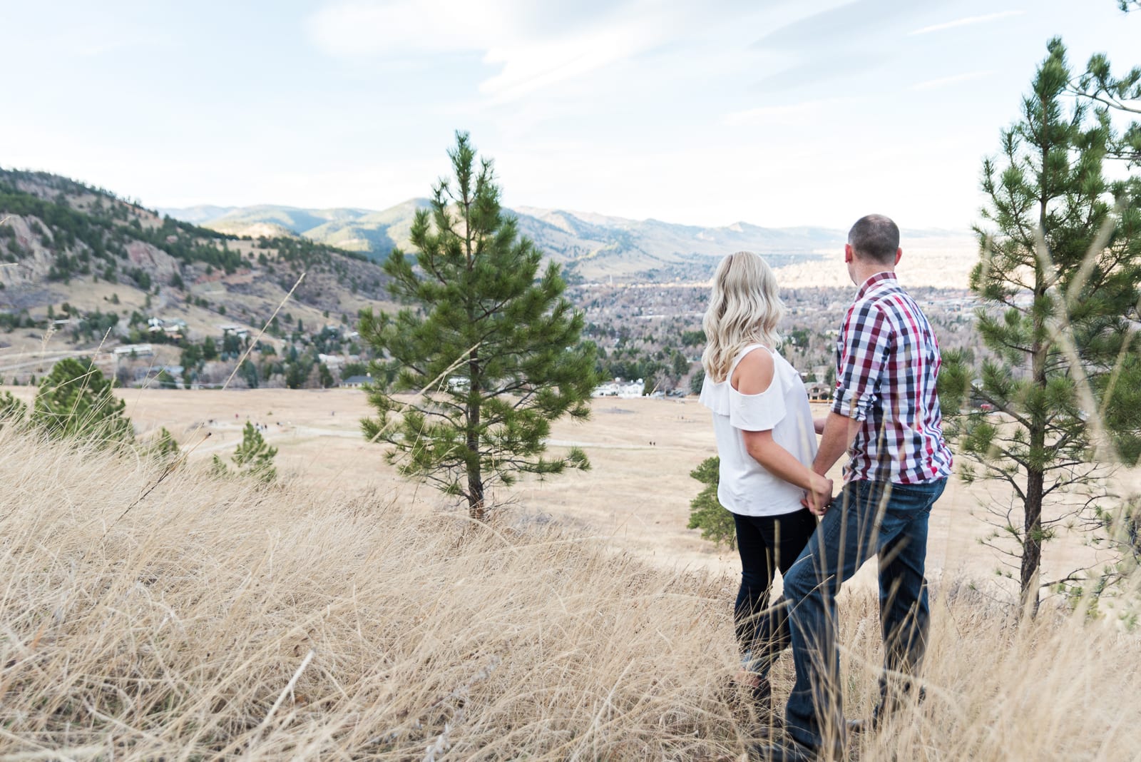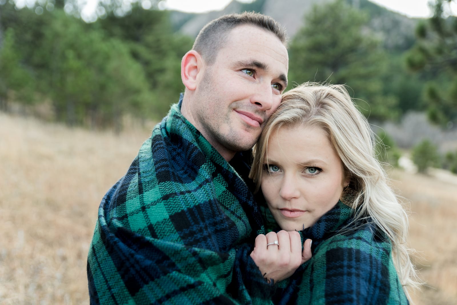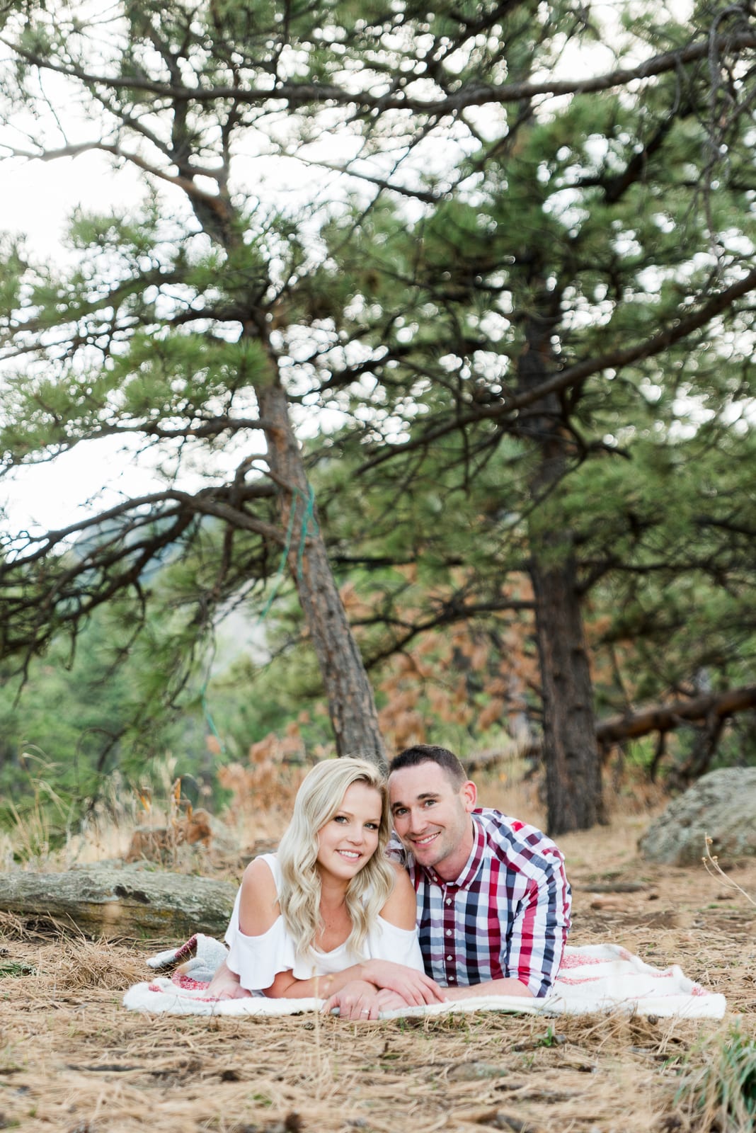 Laurel & DJ looked great during their photo session. Laurel wore two outfits. First was a beautiful blue dress, that really stood out from the browns of the park. Second, she wore a cute cuffed pair of jeans and an off the shoulder white blouse. DJ matched her perfectly in his red plaid button up shirt, and his blue sweater. They both looked incredible. They even brought a cozy blanket to wrap themselves up in for cute, snuggly, photos! We loved spending the day with them and hearing their story!