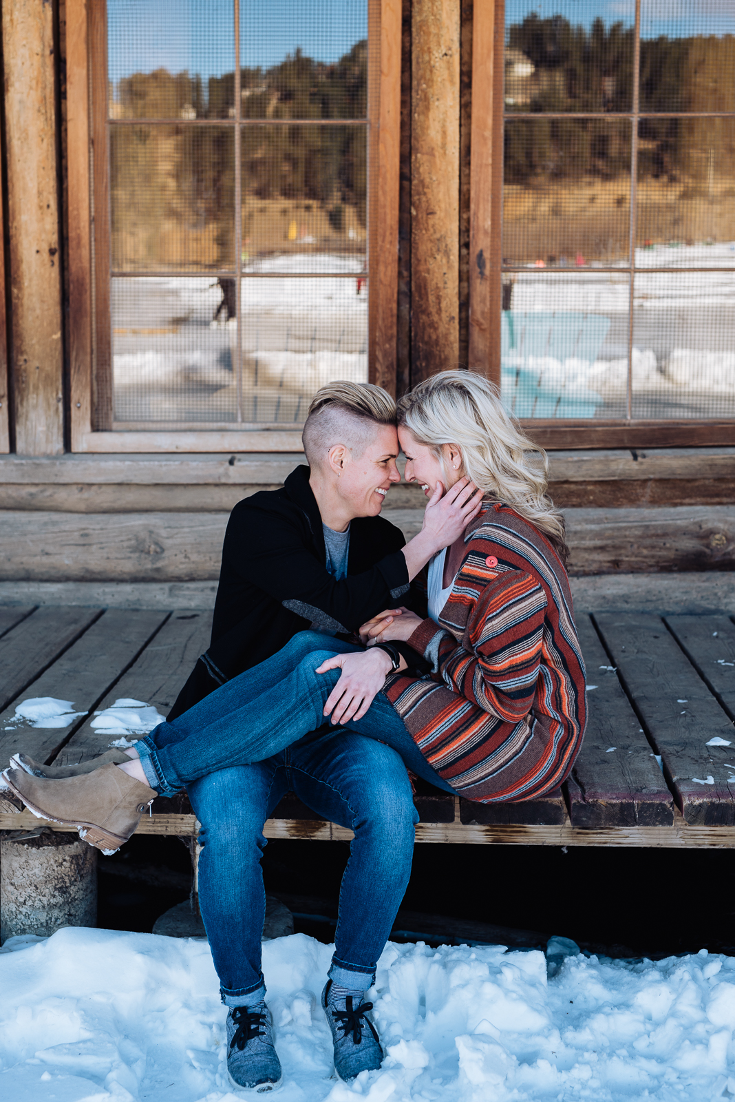 The town of Evergreen is home to a beautiful lake and lake house which both provide an absolutely fantastic environment for a photoshoot. Weather in Colorado can be somewhat unpredictable at times, but on this day, the sun shined as bright as this couple’s future! Despite the sunshine, the weather was still cold enough for us to capture some beloved moments on the lake’s frozen surface and banks. The perfect embodiment of “Colorado weather,” we think!