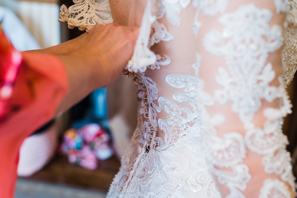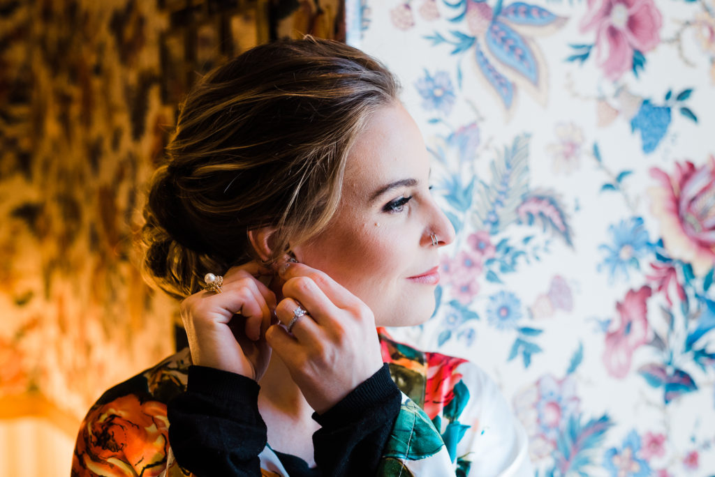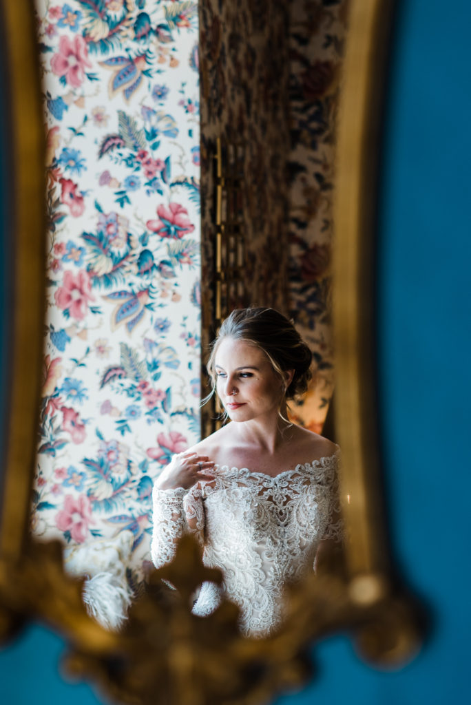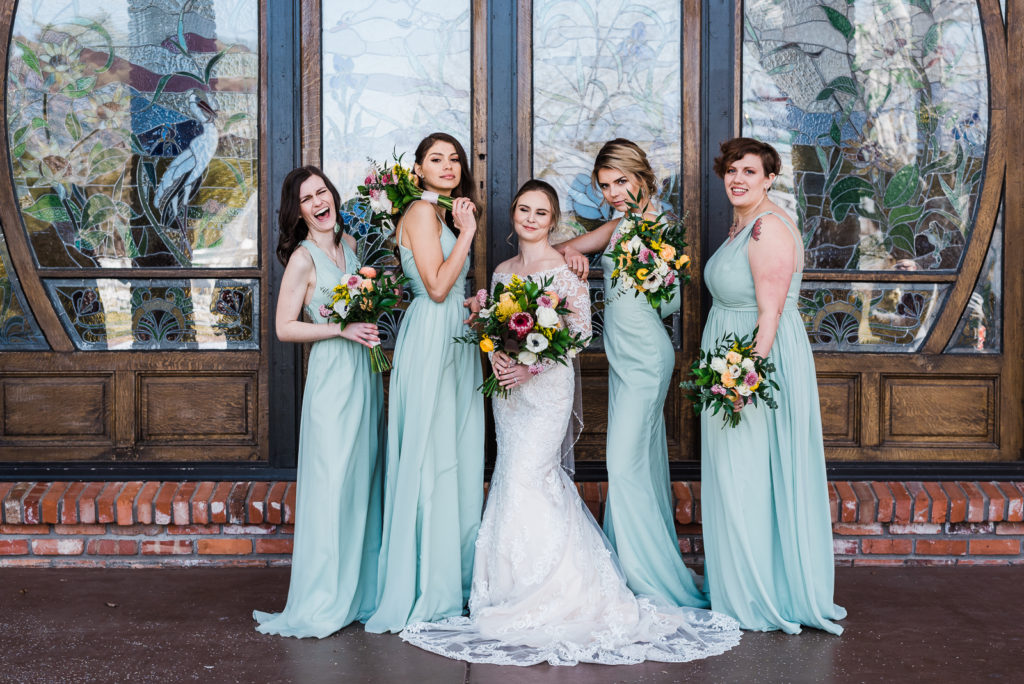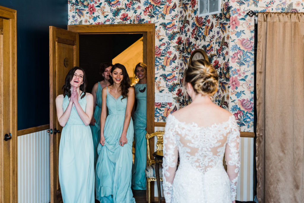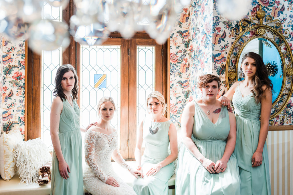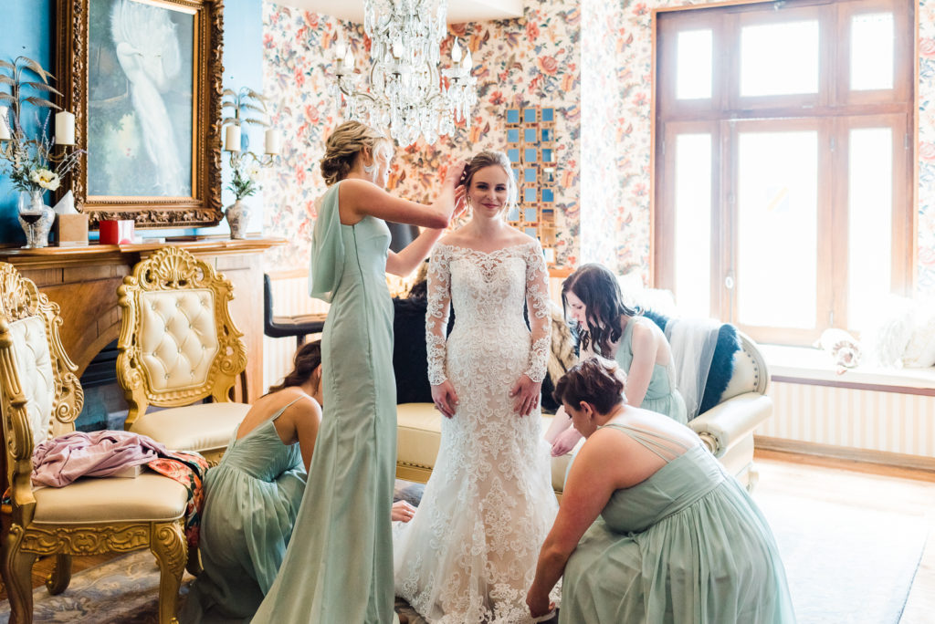 Madison got ready for her big day alongside her favorite ladies! Her bridesmaids wore in pale blue/green dresses reminiscent of a summer sky. Feeling strong in her conviction to wed the love of her life, Madison looked radiant and confident as she prepped for the big moment!