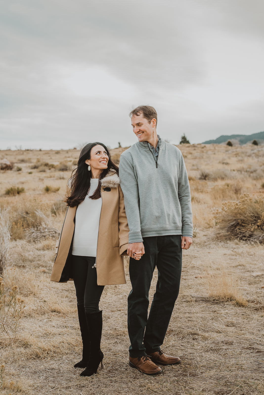 We recommend comfortable shoes with good traction since you will be walking on natural trails. For clothing, earth tones, warm neutrals, and jewel tones complement the natural landscape beautifully. Avoid bright neon colors and busy patterns. Layers are a smart choice since temperatures at the park can shift as the sun moves and the elevation is slightly cooler than Denver.