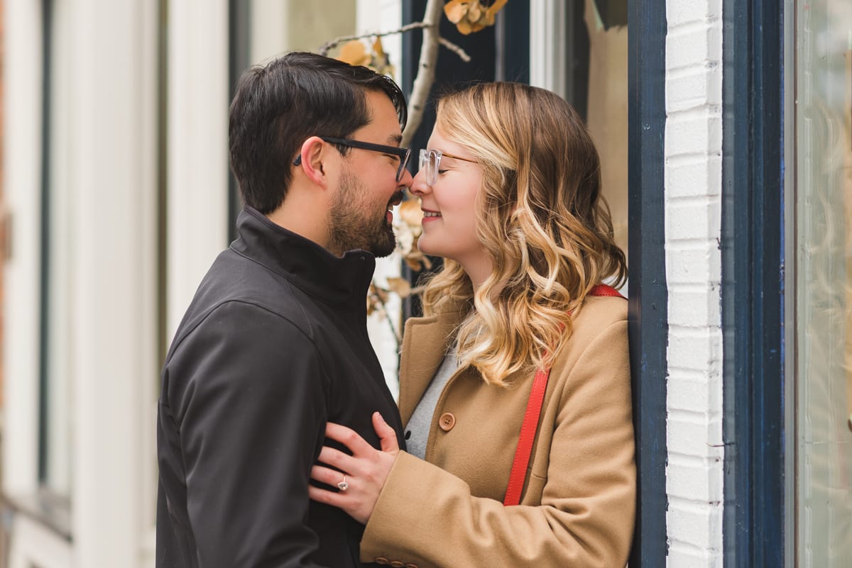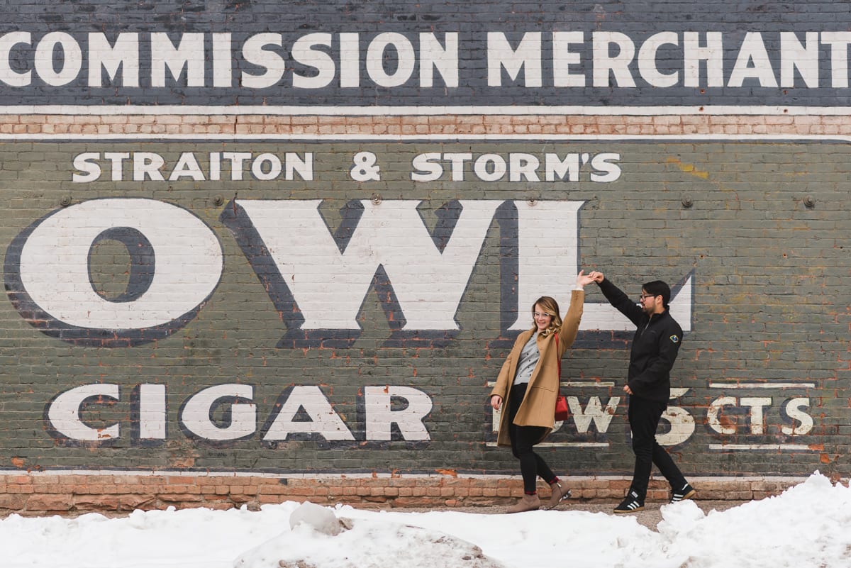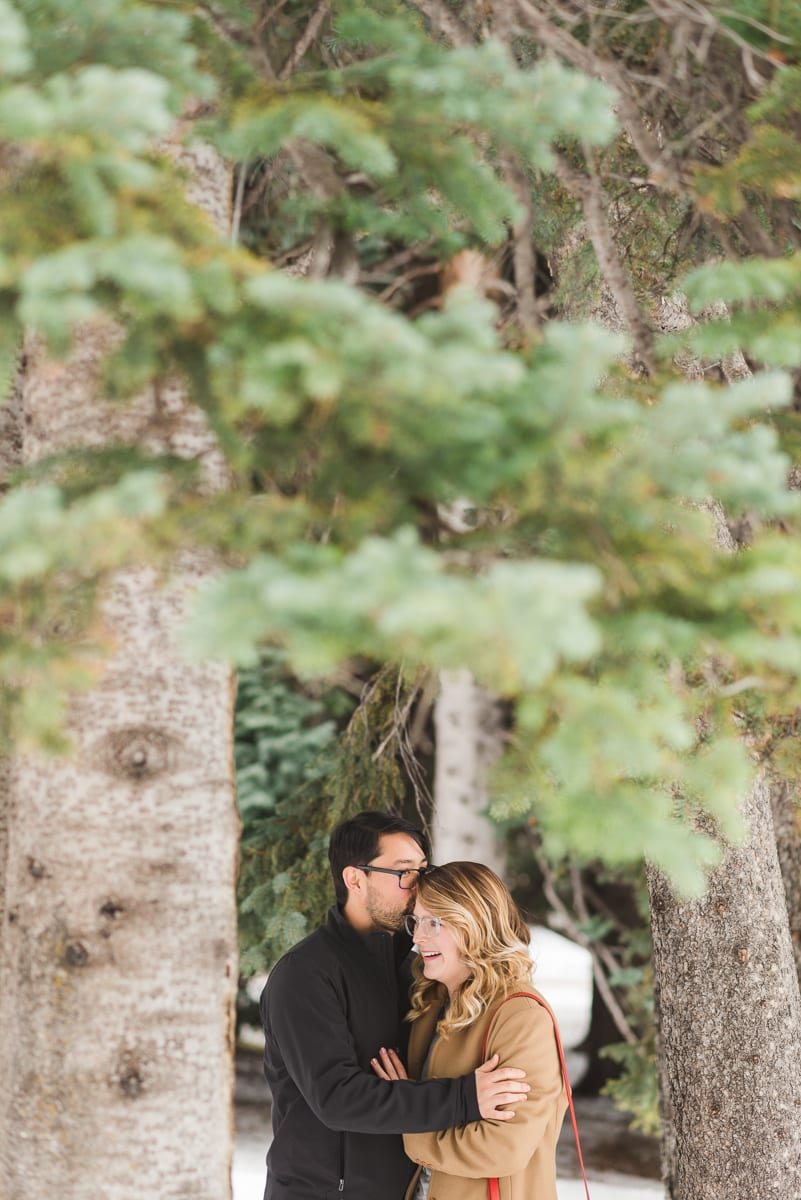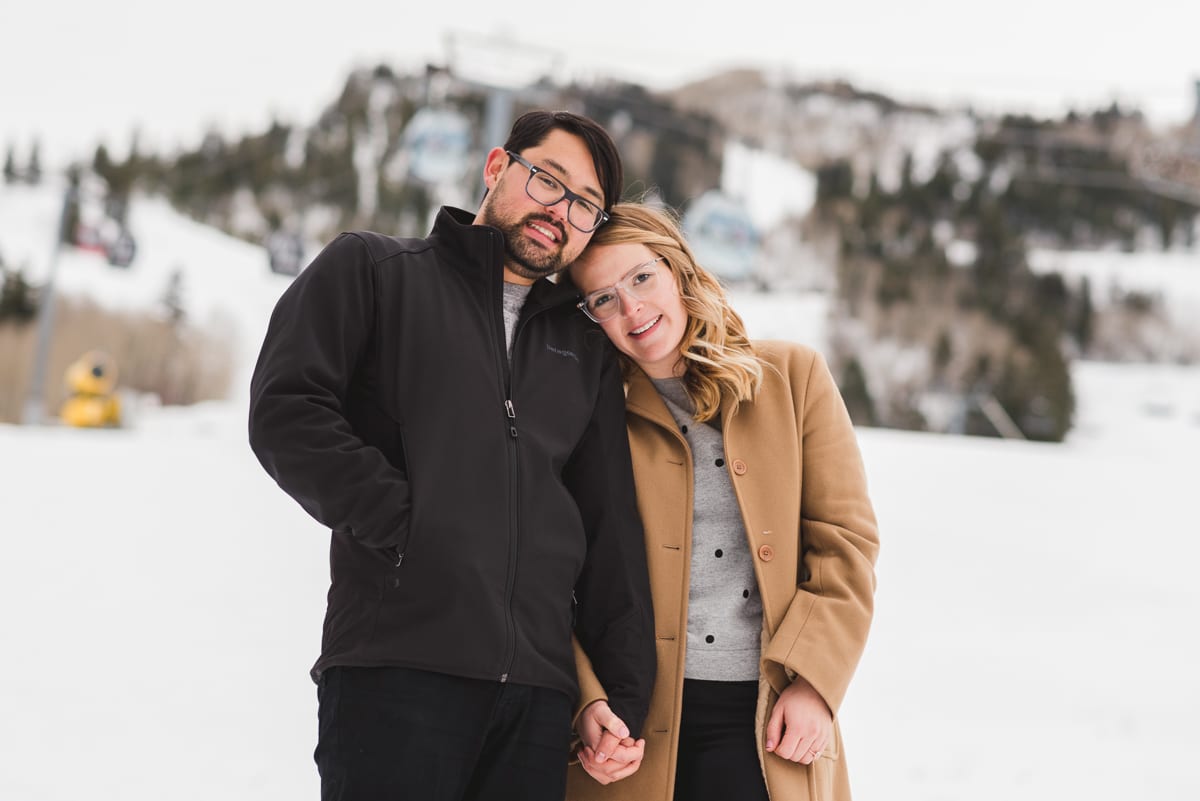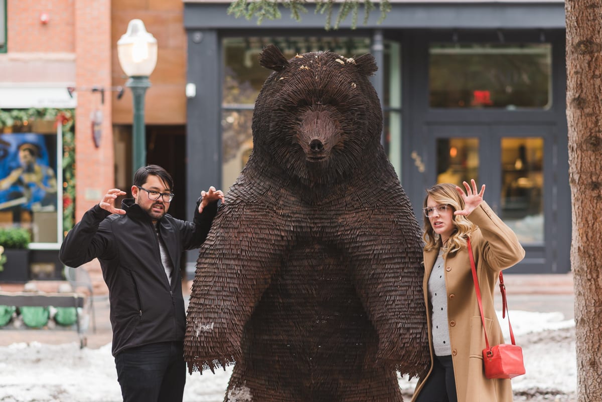 The neutralness of their outfits only added to the winter charm of the rather large mountain town. The duo gave off a very warm, wintery vibe which paired well with the snow-dusted pines around them. Being a historical town, there is still a lot of older architecture. Plus, there are colorfully painted advertisement murals on some of the brick buildings. Together, the couple made the old-timey town feel modern and romantic. We loved the pops of red in Lindsi’s outfit! Not to mention, Tobie picked out a to-die-for ring! Pear shaped engagement rings are a modern take on a classic style.