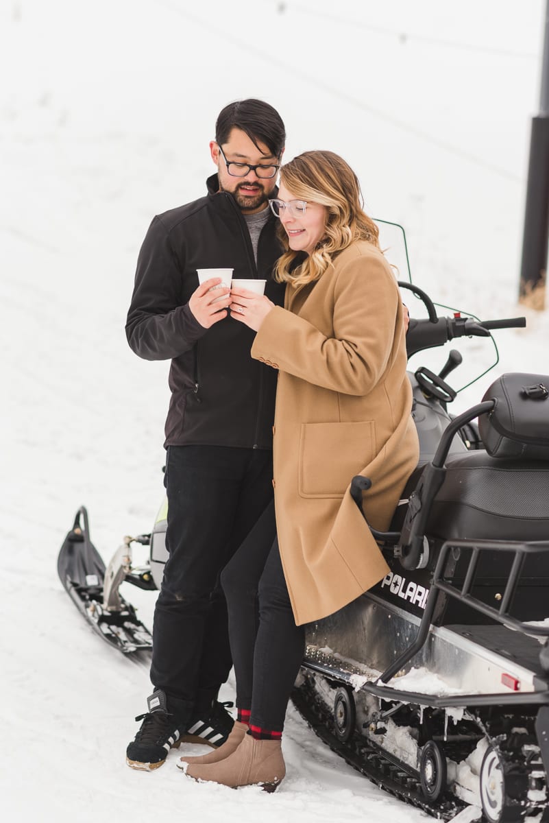 Though they live in texas, Tobie was fortunate enough to have grown up in the beautiful town of Aspen. Lindsi’s family flew to Colorado from Texas to surprise the newly engaged couple, as well as enjoy a celebratory champagne toast. Luckily, Tobie’s dad owns a sushi restaurant, so the celebration bubbly was aplenty! However, that wasn’t the only drink they toasted with! Aspen’s Snowmass ski resort offers free hot chocolate at the bottom of the ski lift. Free hot chocolate + a beautiful newly engaged couple = pure magic!
