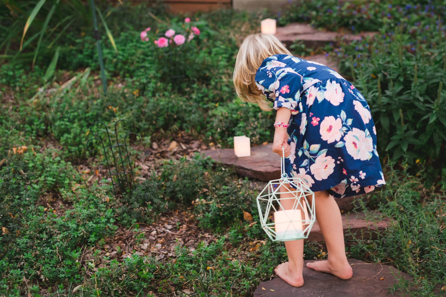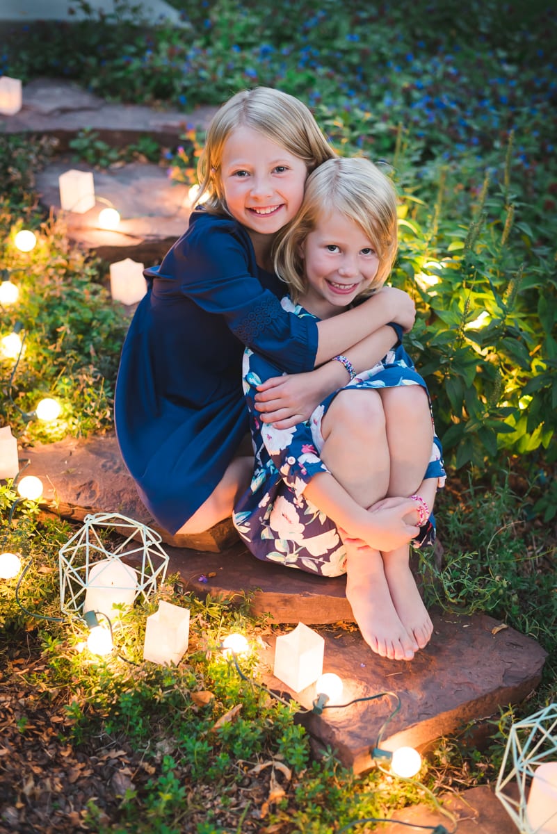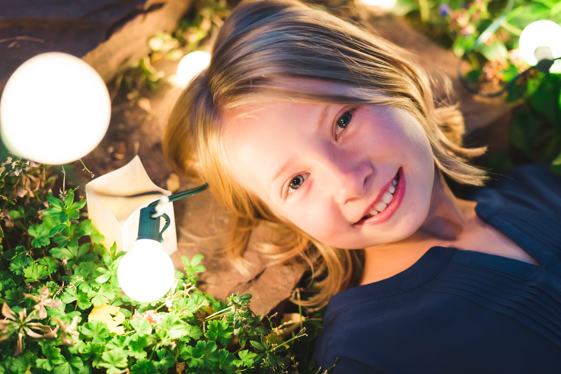 This magical fairy garden came to life in their Boulder, CO backyard by adding a simple stand of round lights. We started off by lighting their yard walkway with the outdoor fairy lights. Their two girls, Astrid and Adwin, sat on the ground and surrounded themselves with the bulbs.