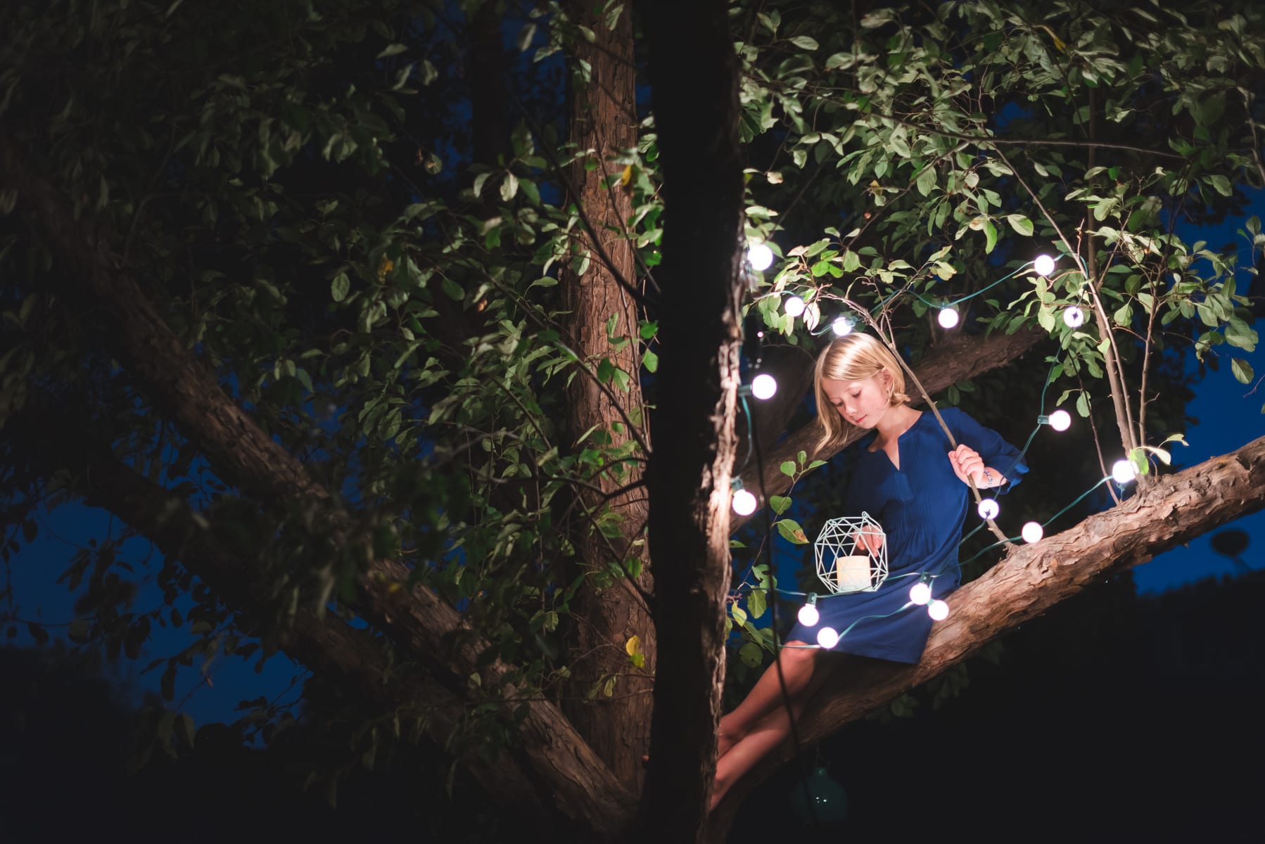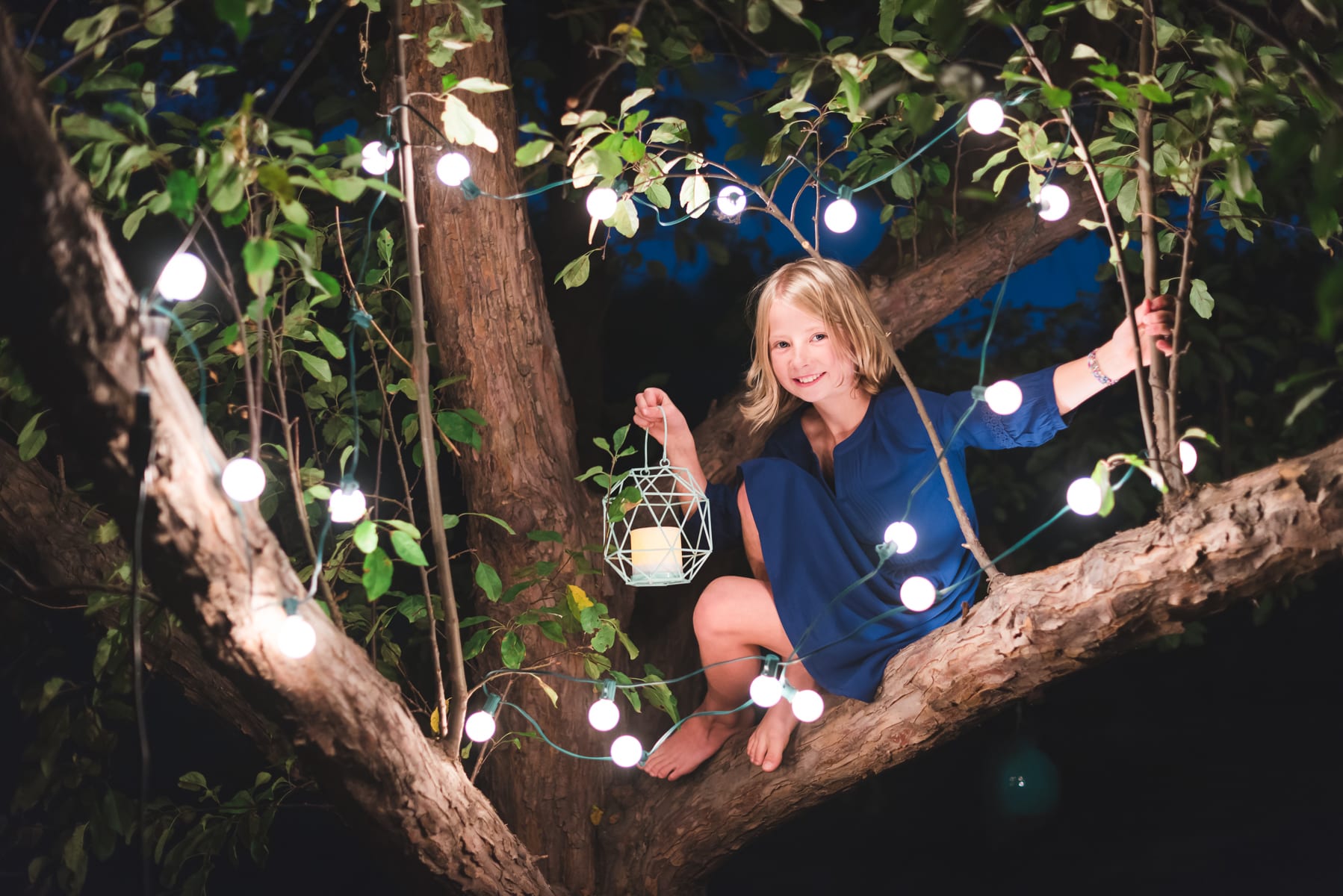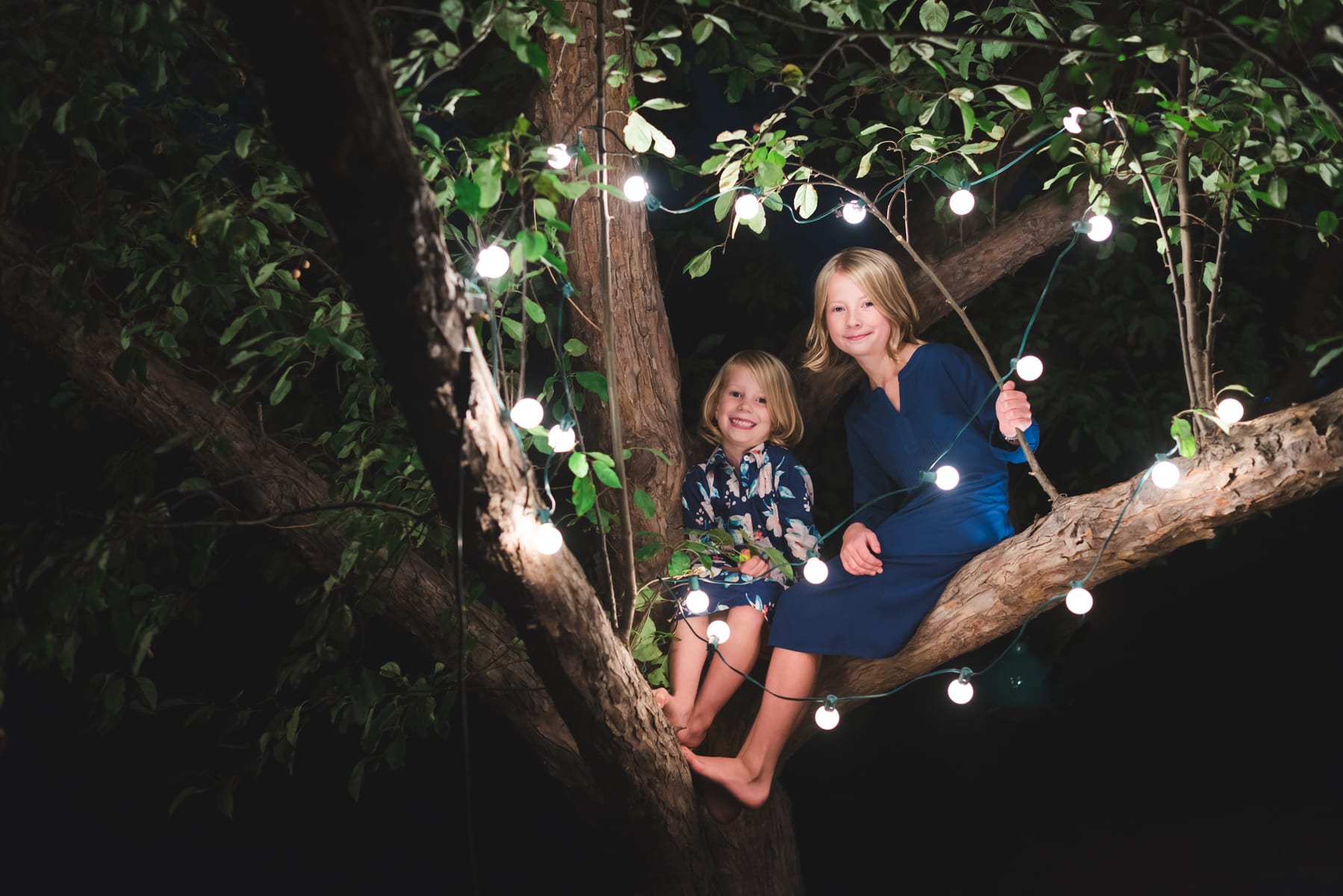 Shortly after that, Astrid became a little restless and started climbing the tree in their backyard and we had a great new idea. Why not string the lights through the tree! We draped the fairy lights in the tree branches right next to the girls to make sure there was enough light to illuminate their faces. They looked like cute little fairies hiding in the tree!