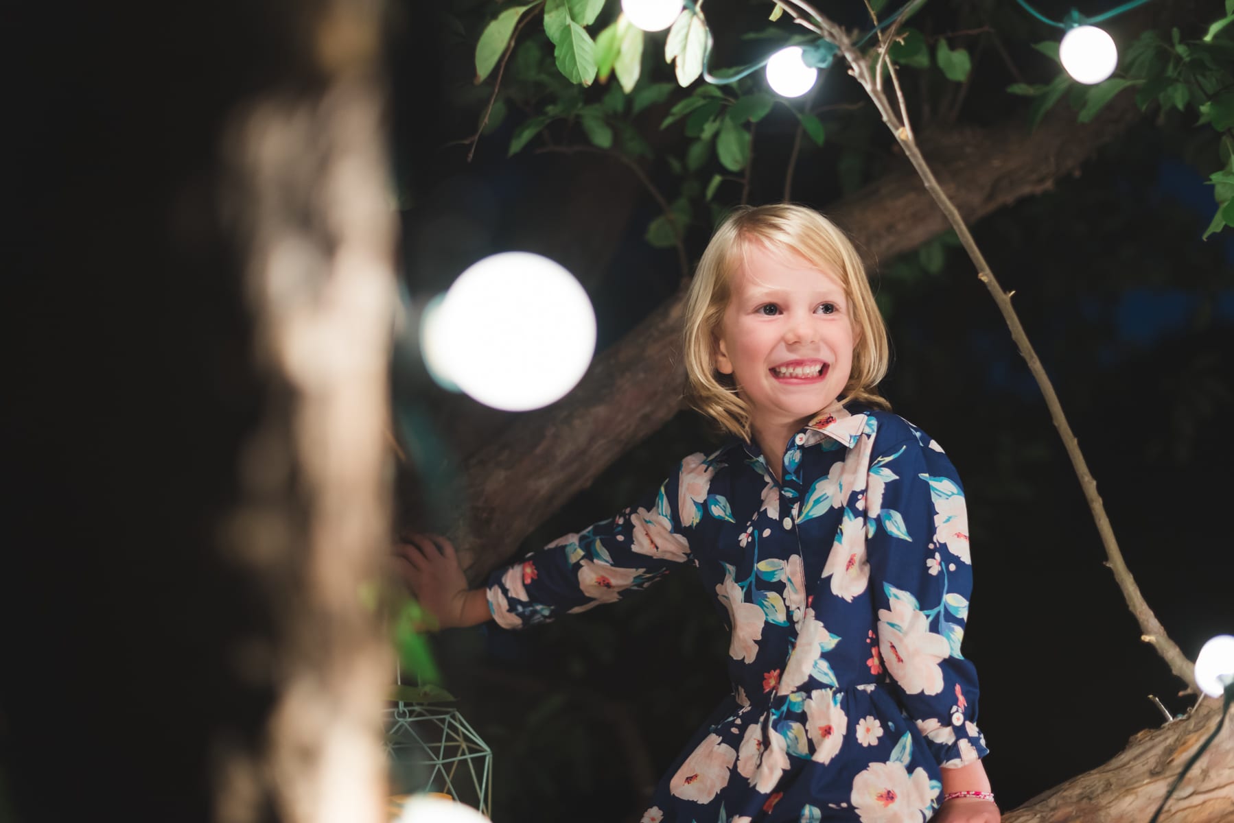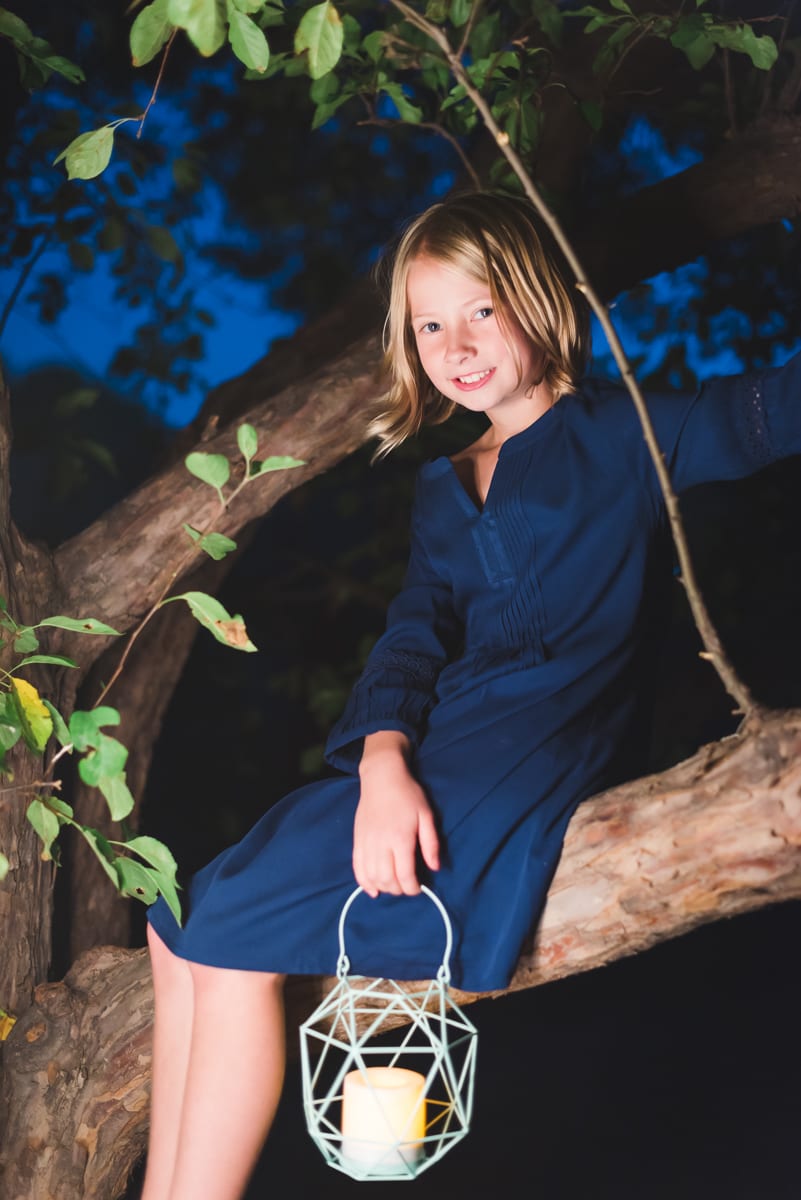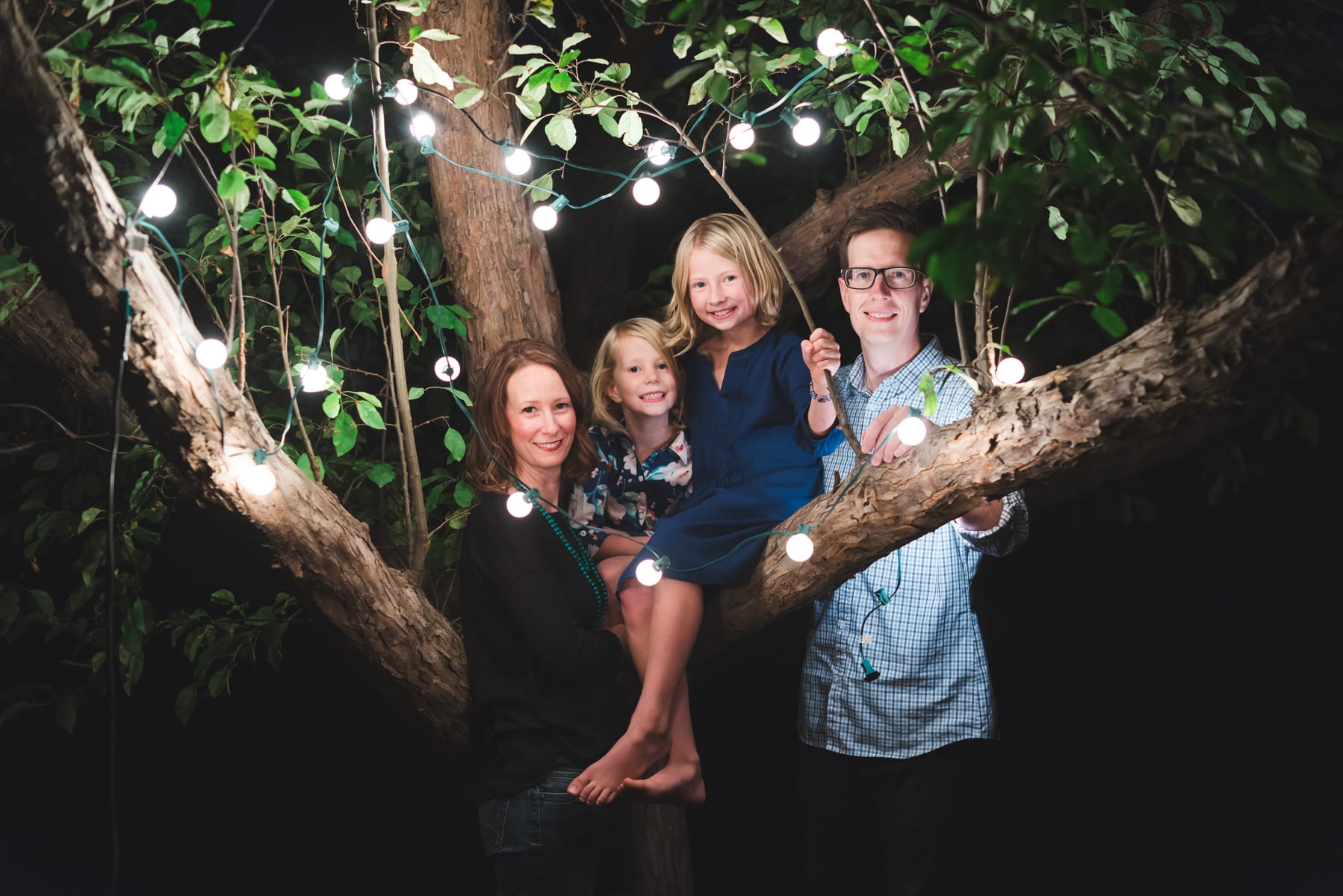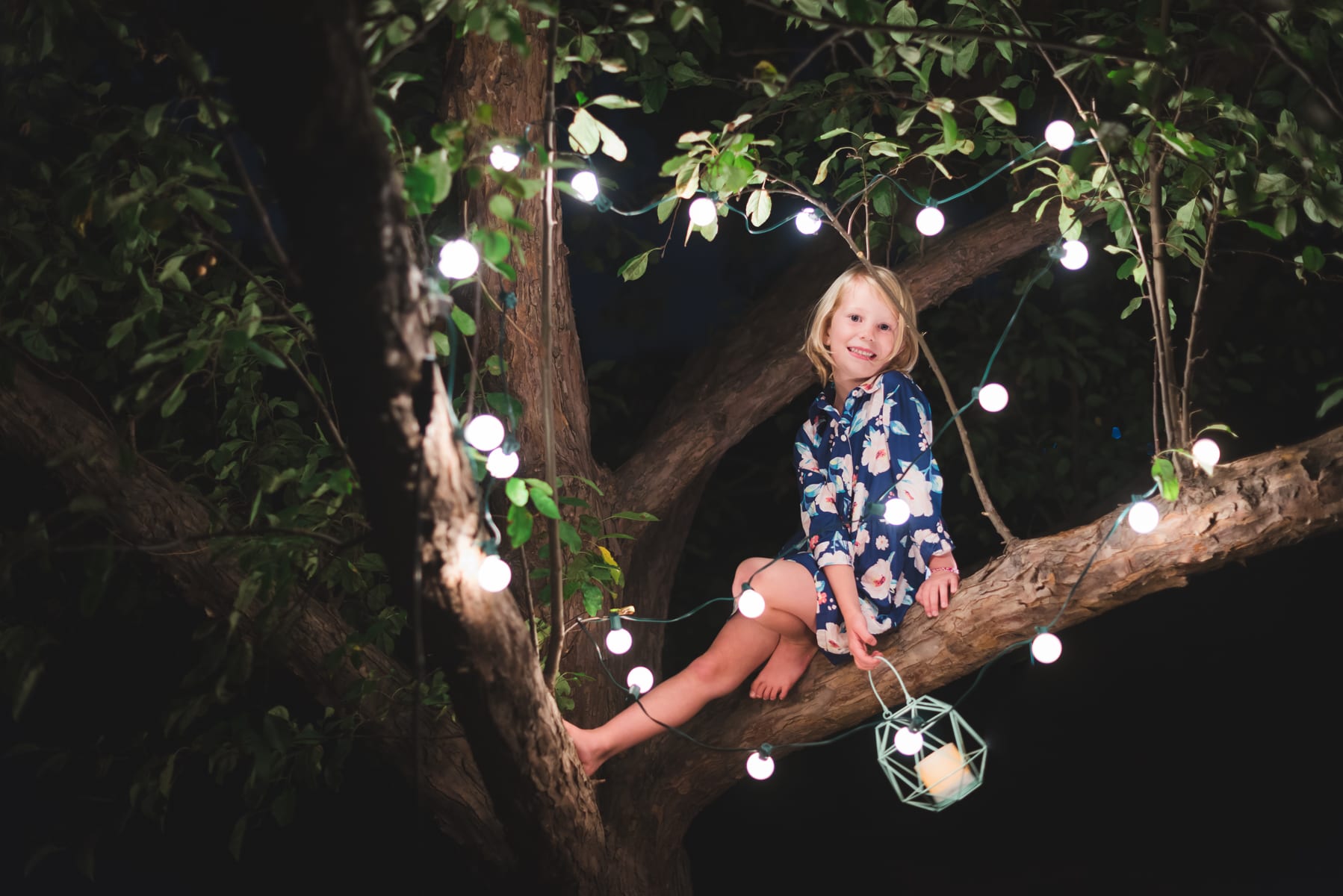 Shortly after that, Astrid became a little restless and started climbing the tree in their backyard and we had a great new idea. Why not string the lights through the tree! We draped the fairy lights in the tree branches right next to the girls to make sure there was enough light to illuminate their faces. They looked like cute little fairies hiding in the tree!