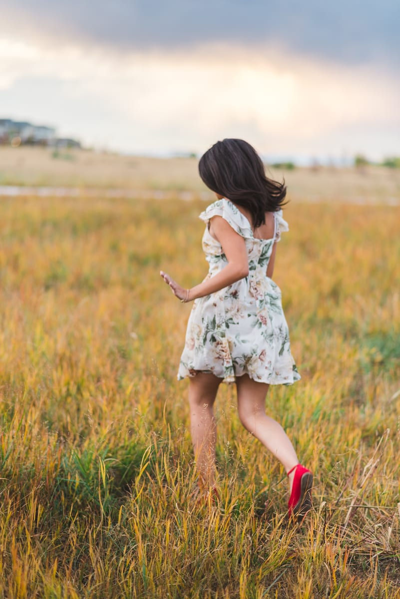Not only was Celia’s dress absolutely adorable, it paired perfectly with the tall wild grasses. Plus, her red flats made the greens and ambers pop even more than her smile did! The colors we captured give off a very elegant woodland vibe even though we were in a local open space. Don’t hesitate to click through our Pinterest for some outfit inspiration.