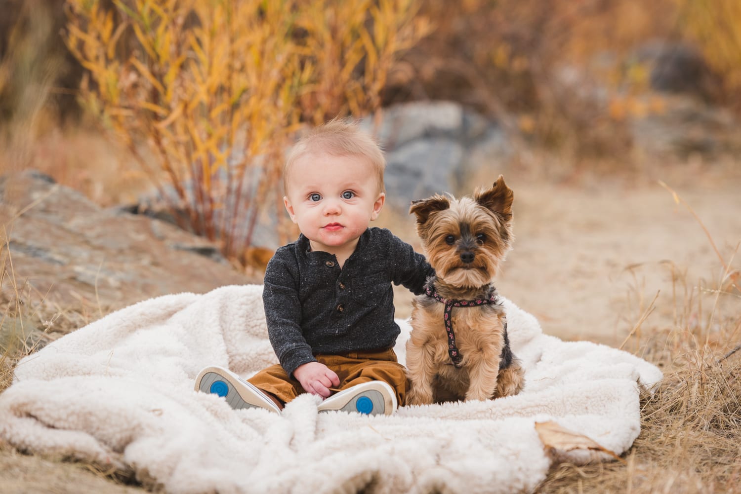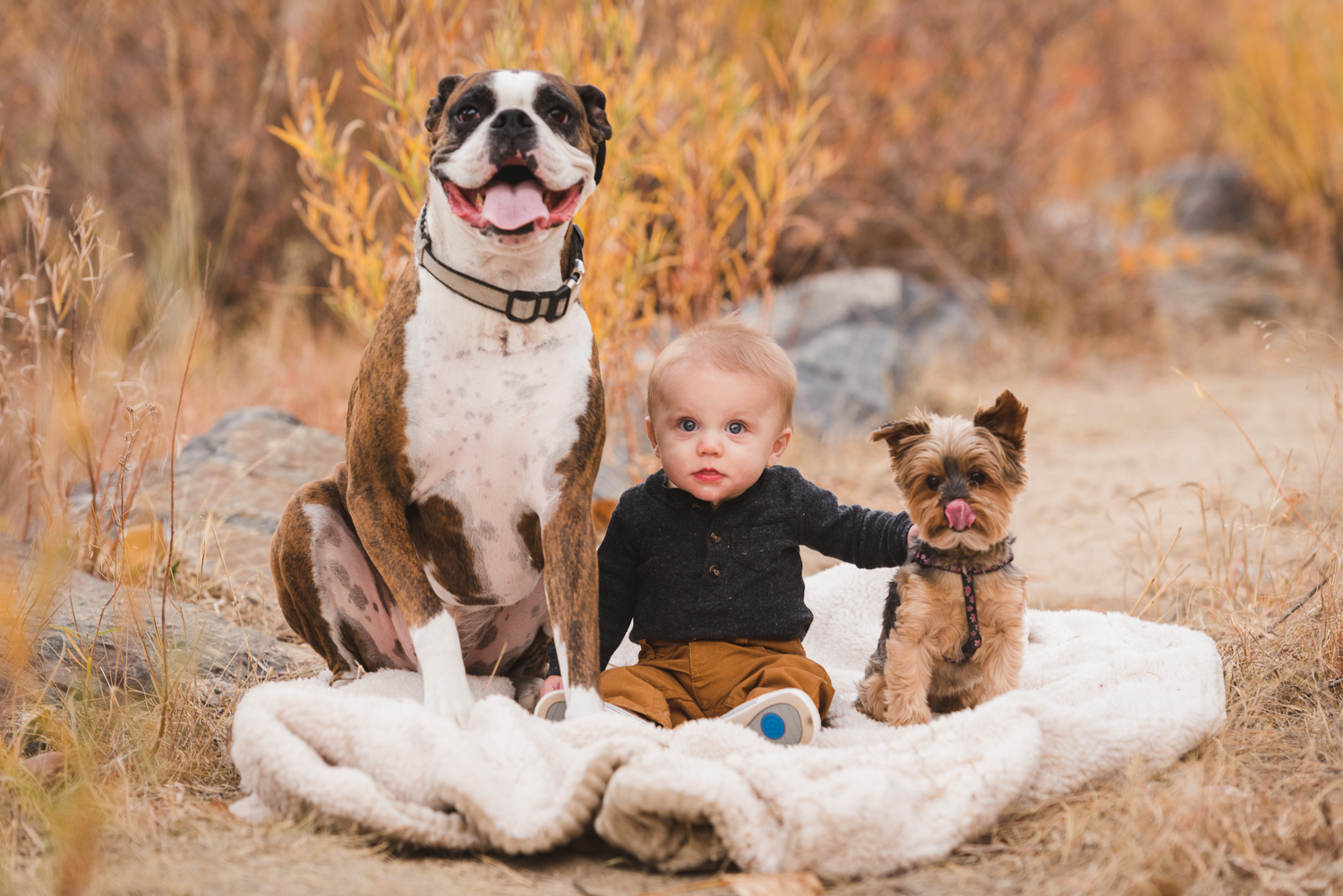 Dogs are great in photo sessions for a multitude of reasons. To name a few: their tongues almost always look cuter than our own, they’re really fashionable (wearing only the most current season’s furs), they don’t have any bad angles, and they look at their humans with the entire world in their big saucer eyes. Plus, babies and dogs go together like peanut butter and jelly.