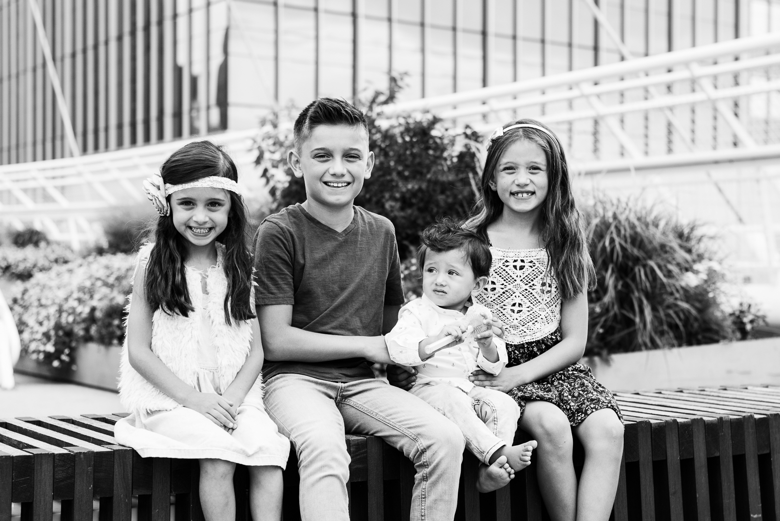 These four children all stand at different heights, and Mom and Dad are nearly the same. This situation honestly couldn’t have been easier to work with. We balanced levels by placing the tall parents on the end of their shorter children. We even created a funnel effect where Mom and Dad in the middle had their adorable children sitting on their sides for a kind of mountain-like cascade effect.