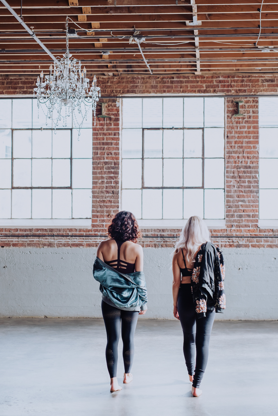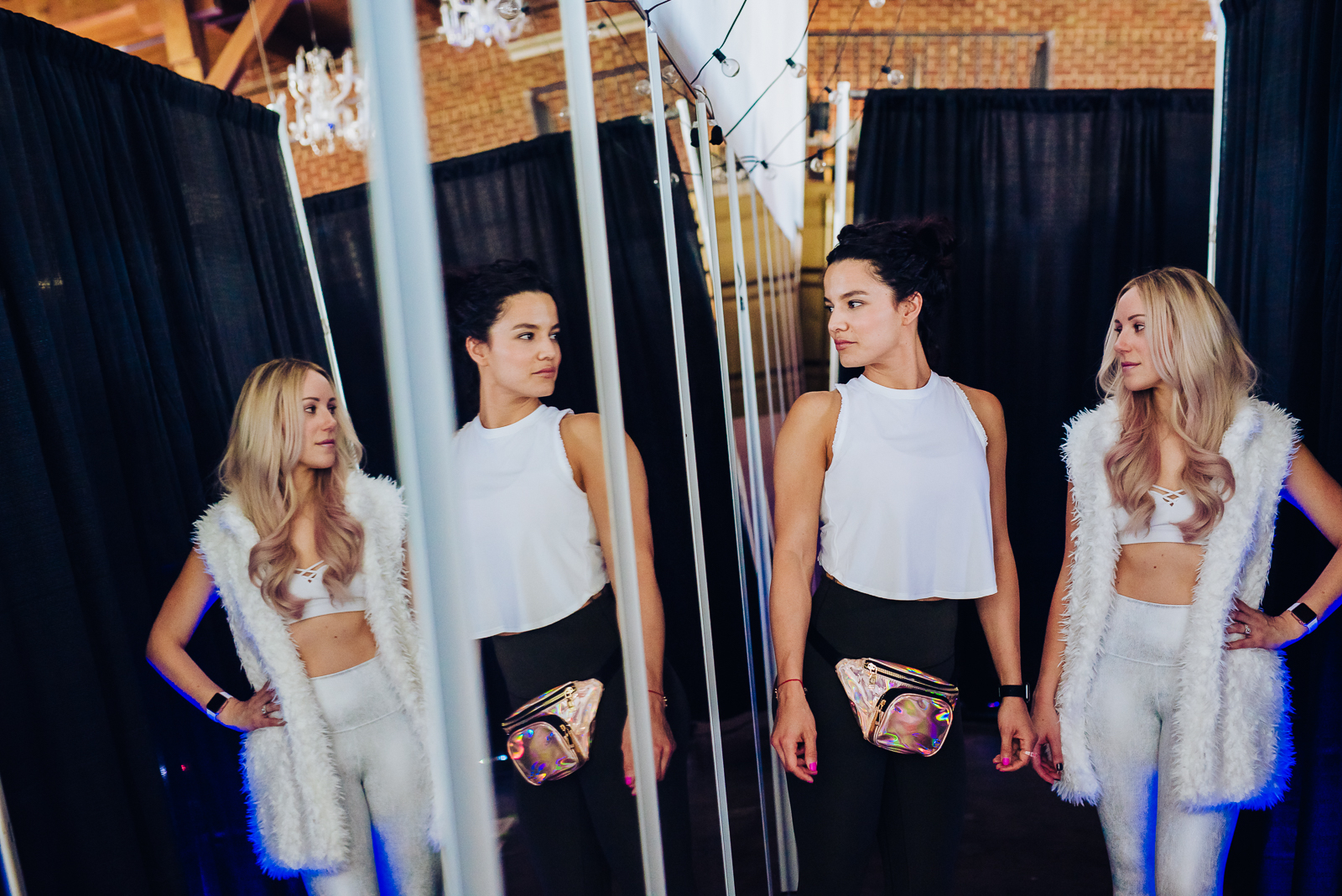 Next, we took our photo session to Moss Denver, a chic Denver venue in the Santa Fe Arts District. The place is used for both real and style shoots all the time! This place has giant brick walls and wooden furniture that look so natural with greenery and – yep, moss – all around. Simona and Steph got right into the barre groove in this studio space. Their breathable workout clothes mixed with fabulous furs and sparkling fanny packs gave us Spice Girls mixed with Wonder Woman vibes. With every squat and back bend, these ladies proved that you can be both fit, focused, and glamorous all at once!