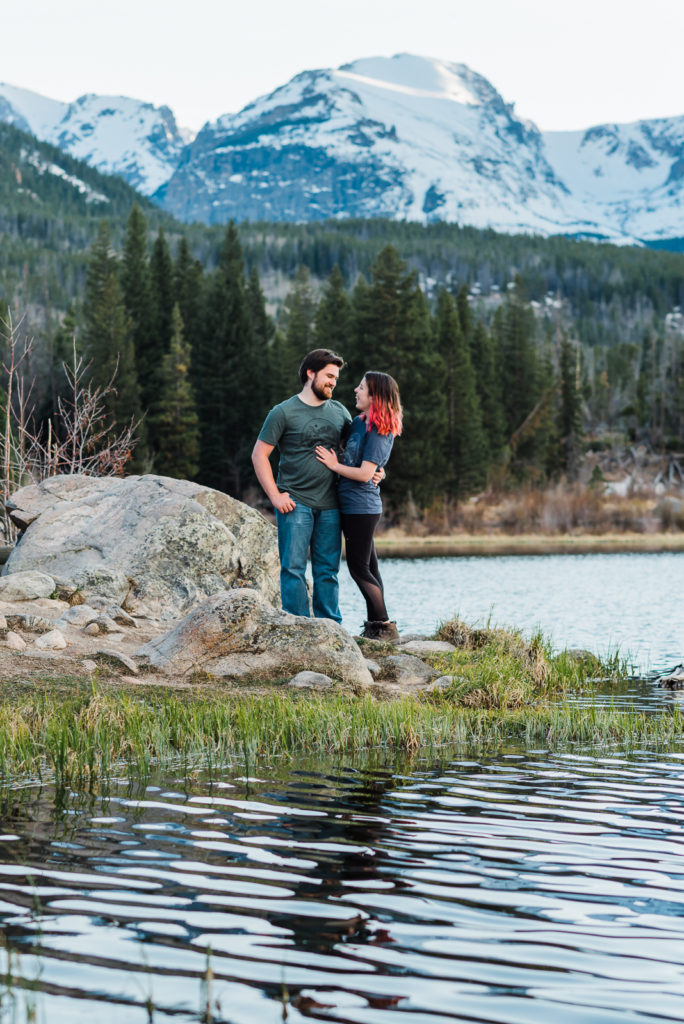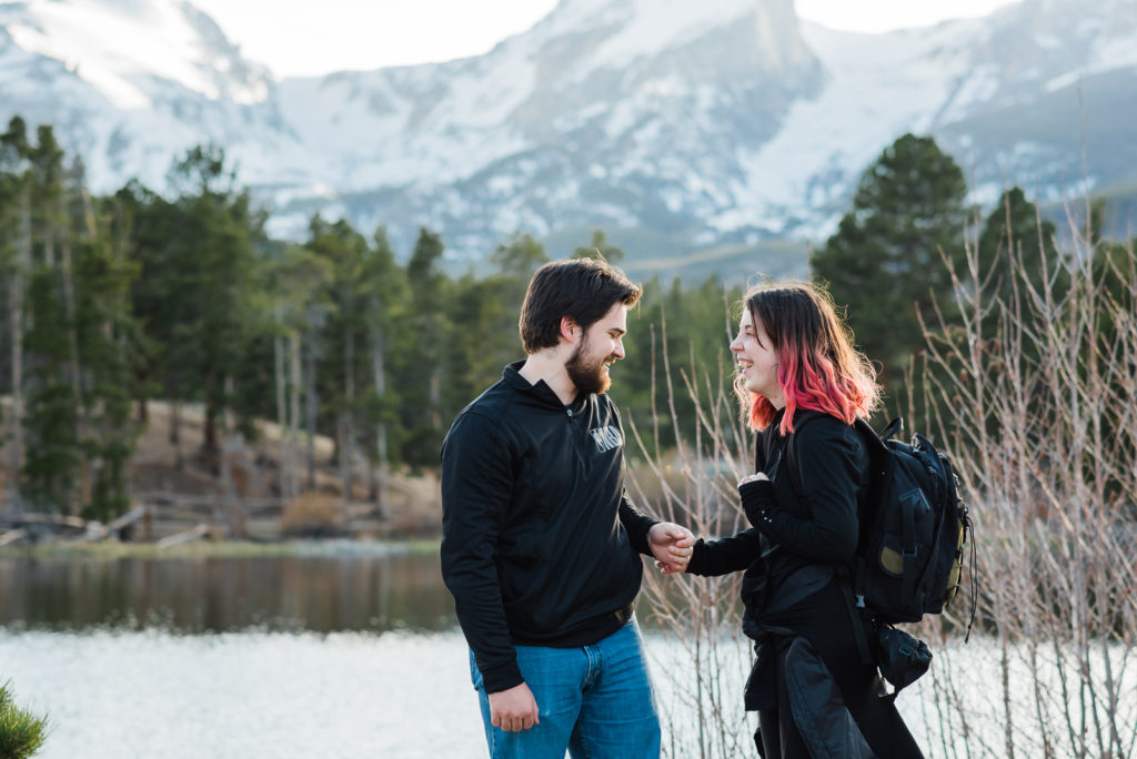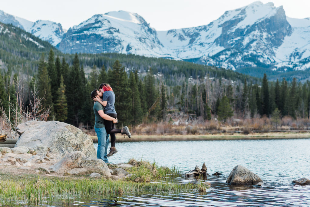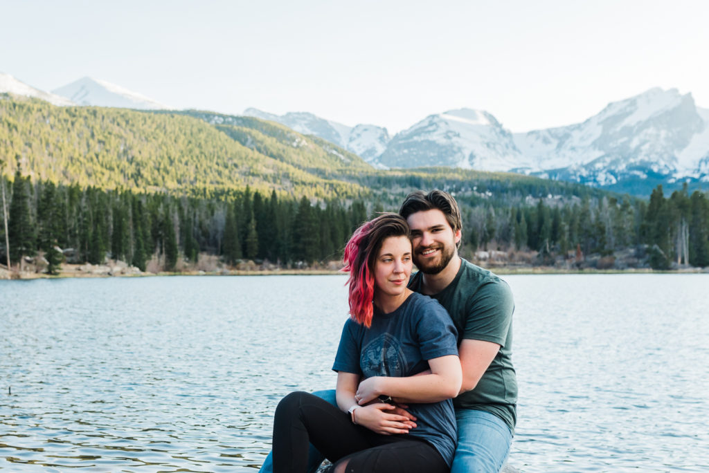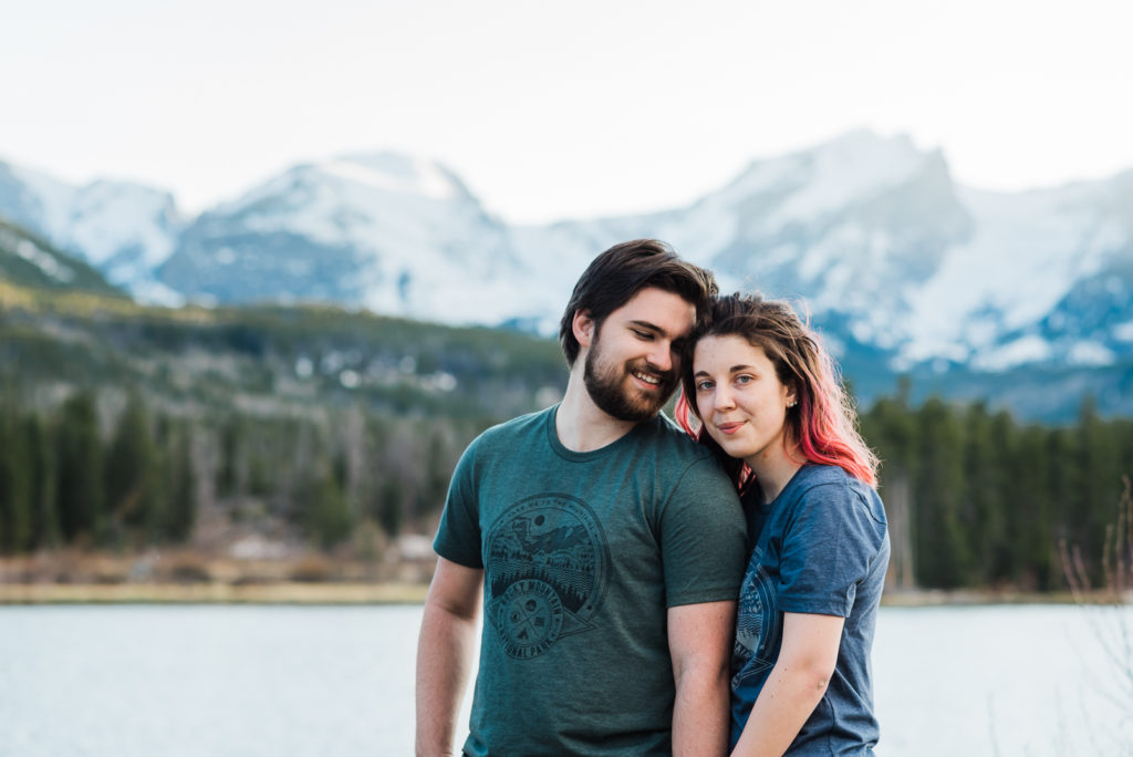 It’s not surprising that this adorable couple were high-school sweethearts! Just look how they glowed in each other’s arms! As they both love nature, Josh wanted to take her to the Colorado Rocky Mountains to propose. He waited until their second day in the mountains, and until they were at a nice scenic outlook. They settled in the beauty of Sprague lake with snow-tipped mountains in the background.