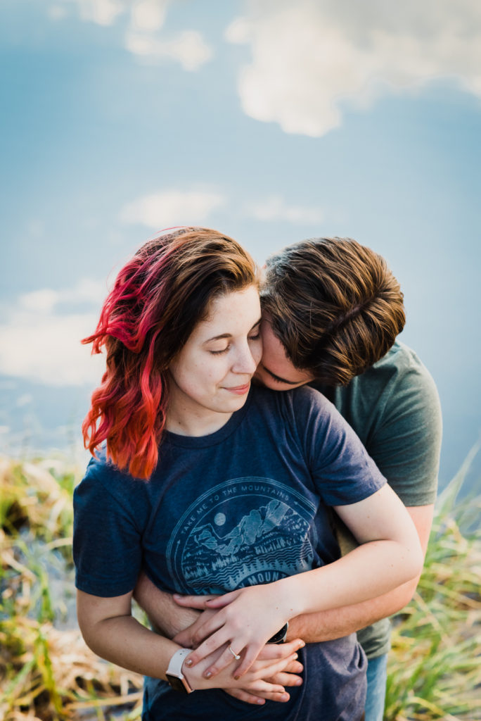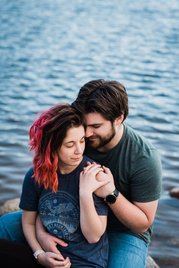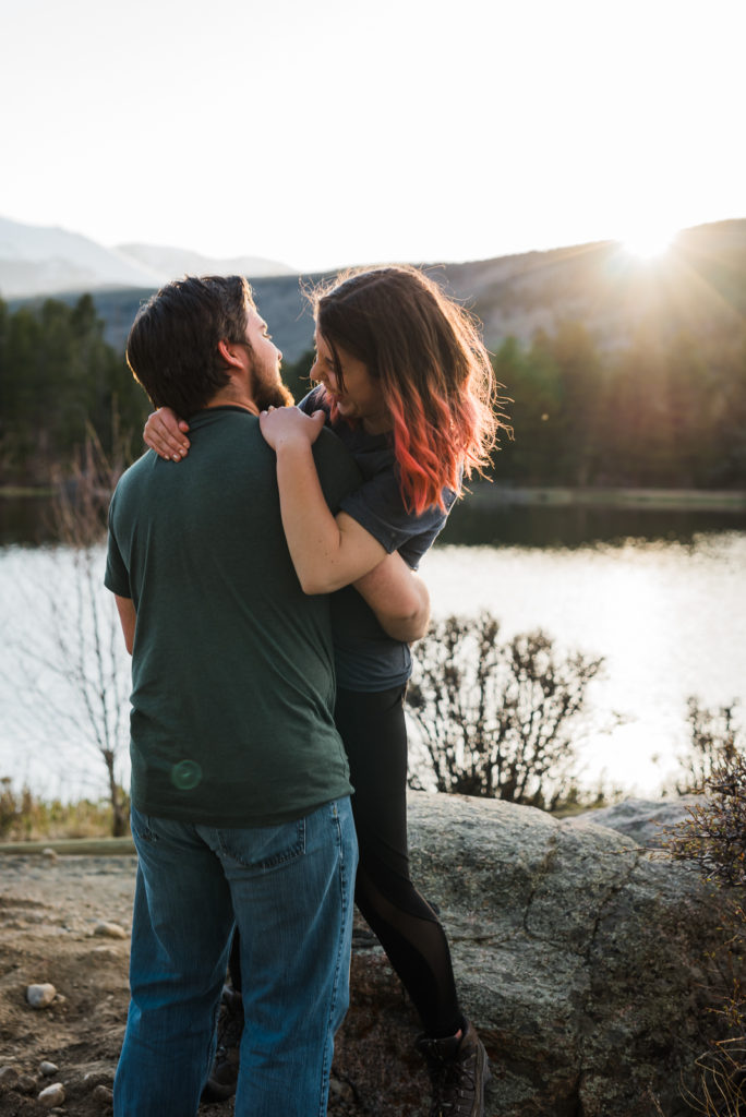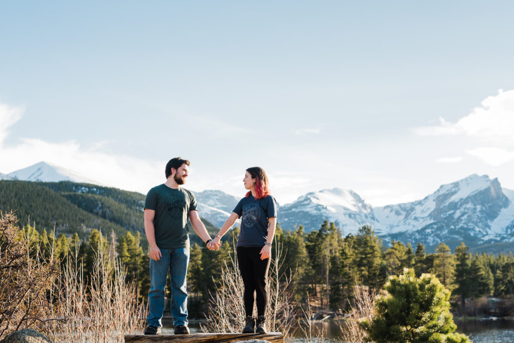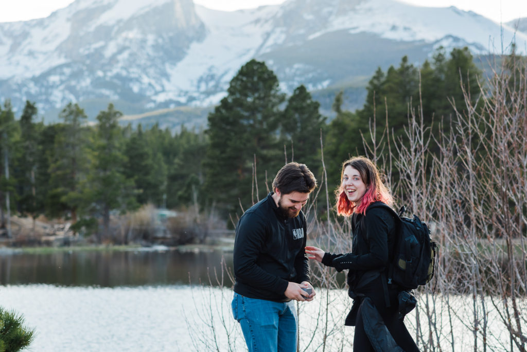 It’s not surprising that this adorable couple were high-school sweethearts! Just look how they glowed in each other’s arms! As they both love nature, Josh wanted to take her to the Colorado Rocky Mountains to propose. He waited until their second day in the mountains, and until they were at a nice scenic outlook. They settled in the beauty of Sprague lake with snow-tipped mountains in the background.