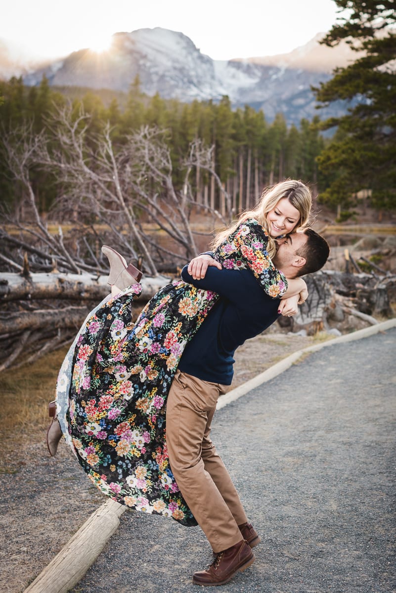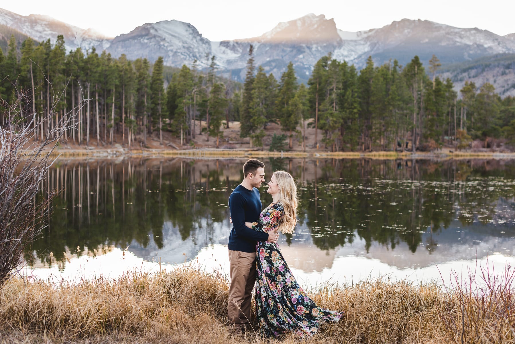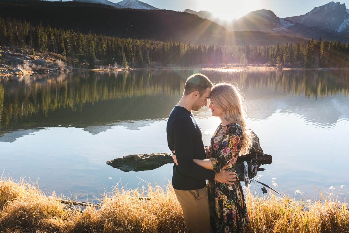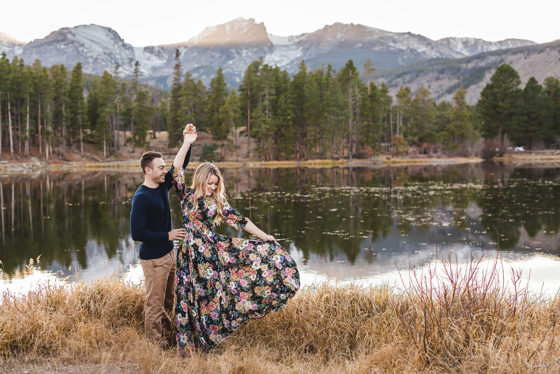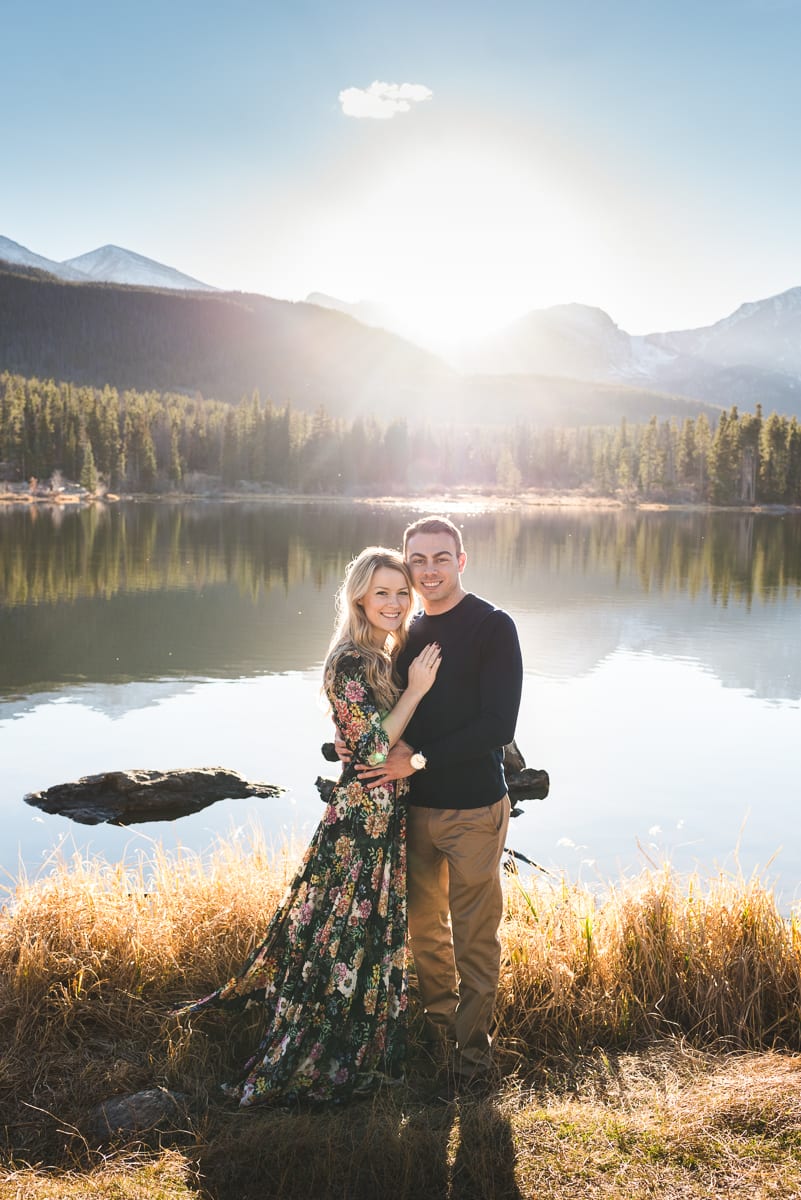 Bet you didn’t expect this mid-November Rocky Mountain National Park engagement photo session to be bright, sunny, and just the perfect temperature for a flowing dress! Honestly, we didn’t either. But now that we are covered in a blanket of snow, we are very grateful. As were Rachel and Hunter, our adorable subjects who playfully posed for their sun-streaked engagement photos at Sprague Lake.
