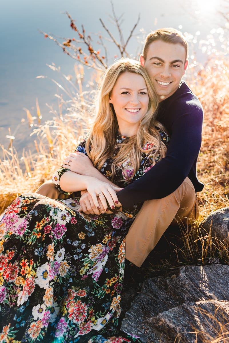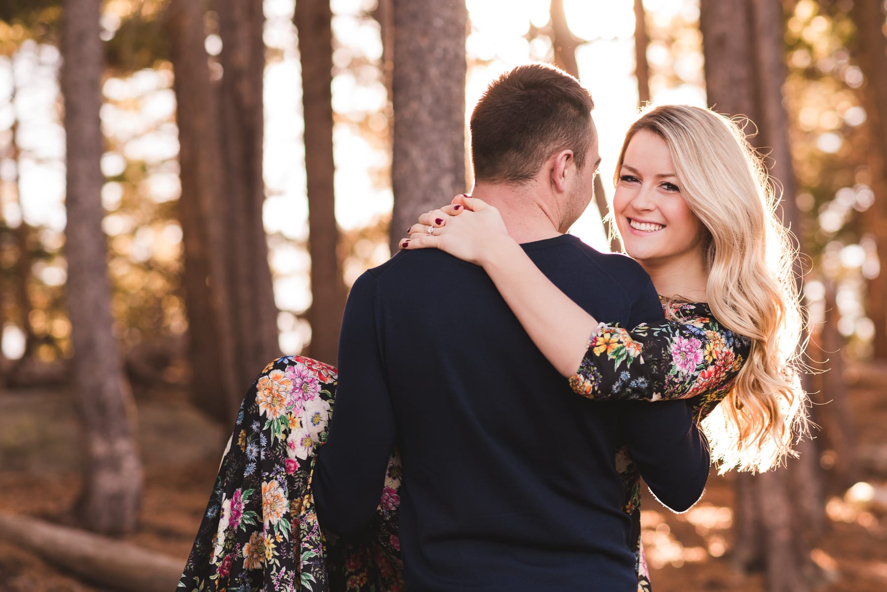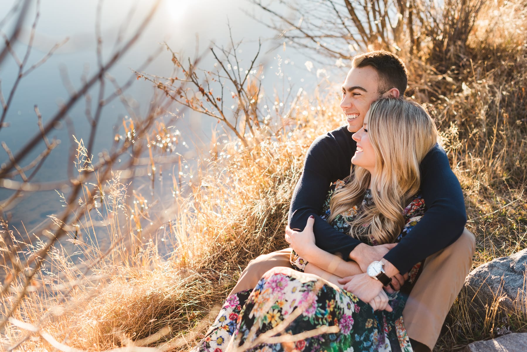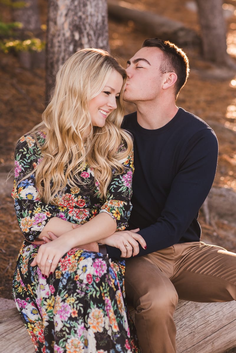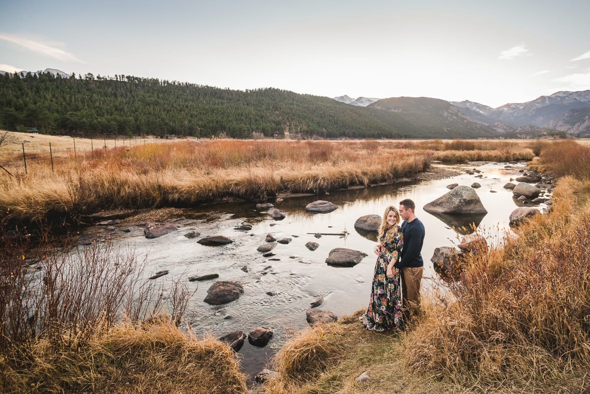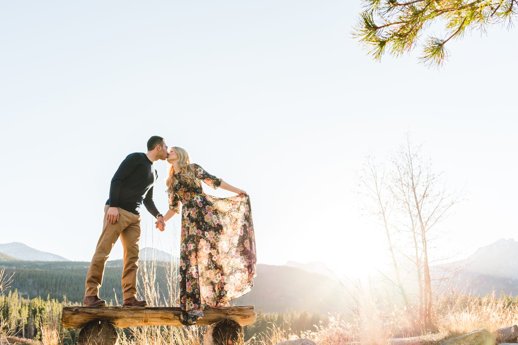 Bet you didn’t expect this mid-November Rocky Mountain National Park engagement photo session to be bright, sunny, and just the perfect temperature for a flowing dress! Honestly, we didn’t either. But now that we are covered in a blanket of snow, we are very grateful. As were Rachel and Hunter, our adorable subjects who playfully posed for their sun-streaked engagement photos at Sprague Lake.