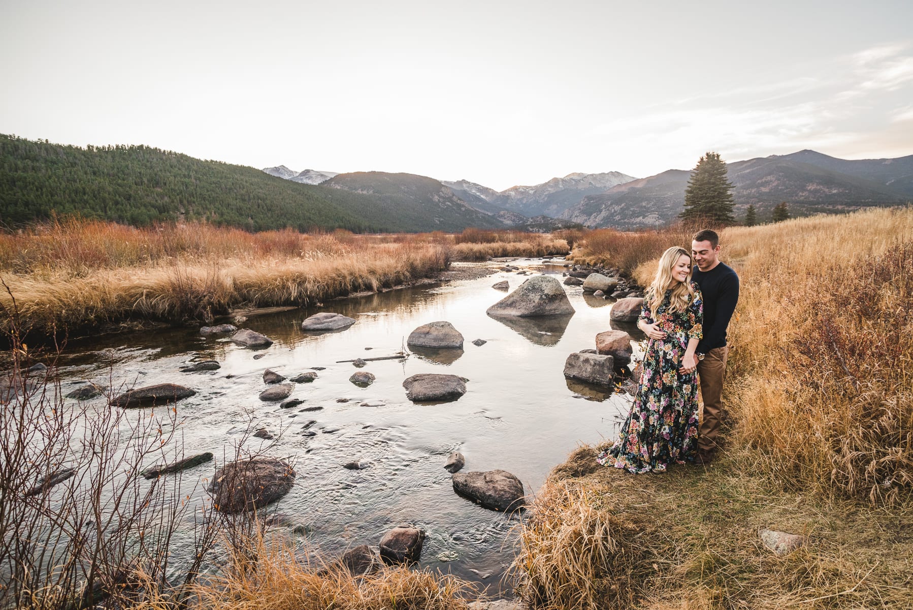 Our favorite moment during this romantic Rocky Mountain National Park engagement photo session was happening upon some fishermen. With our fingers crossed for luck, we approached them with the request to incorporate them into our photos. To our delight, they were on board!