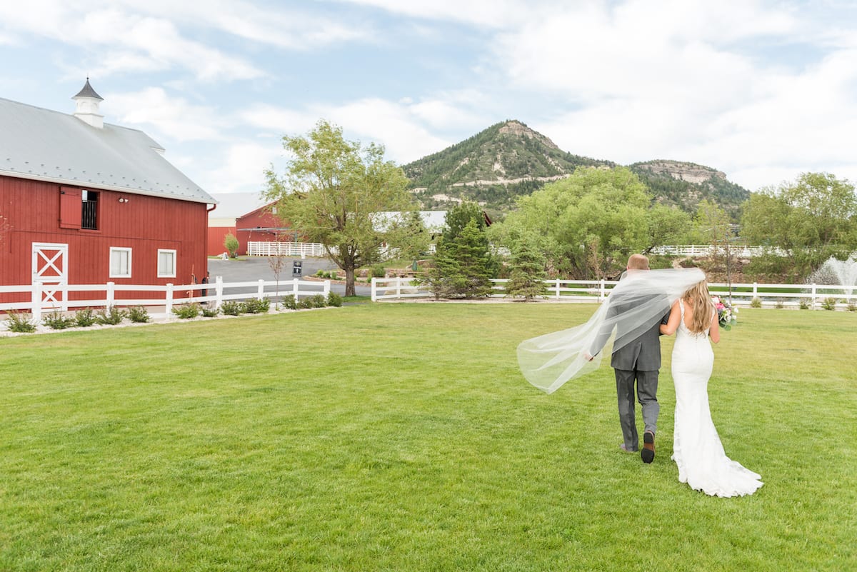 Finally, the music begins to play, signifying the arrival of his bride to be. Tanna Ruzicka, led by her father, is radiant as any bride is on her wedding day. She glides throughout the field, those same arch flowers dangling from her bouquet as she waves to her family and friends. She wears a delicate lace dress, the peep of her brown boots just barely visible as she makes her way towards Taylor. Finally, they stand together — their smiling profiles captured before the mountains that surround Crooked Willow Farms, a quant venue located in Larkspur, Colorado.