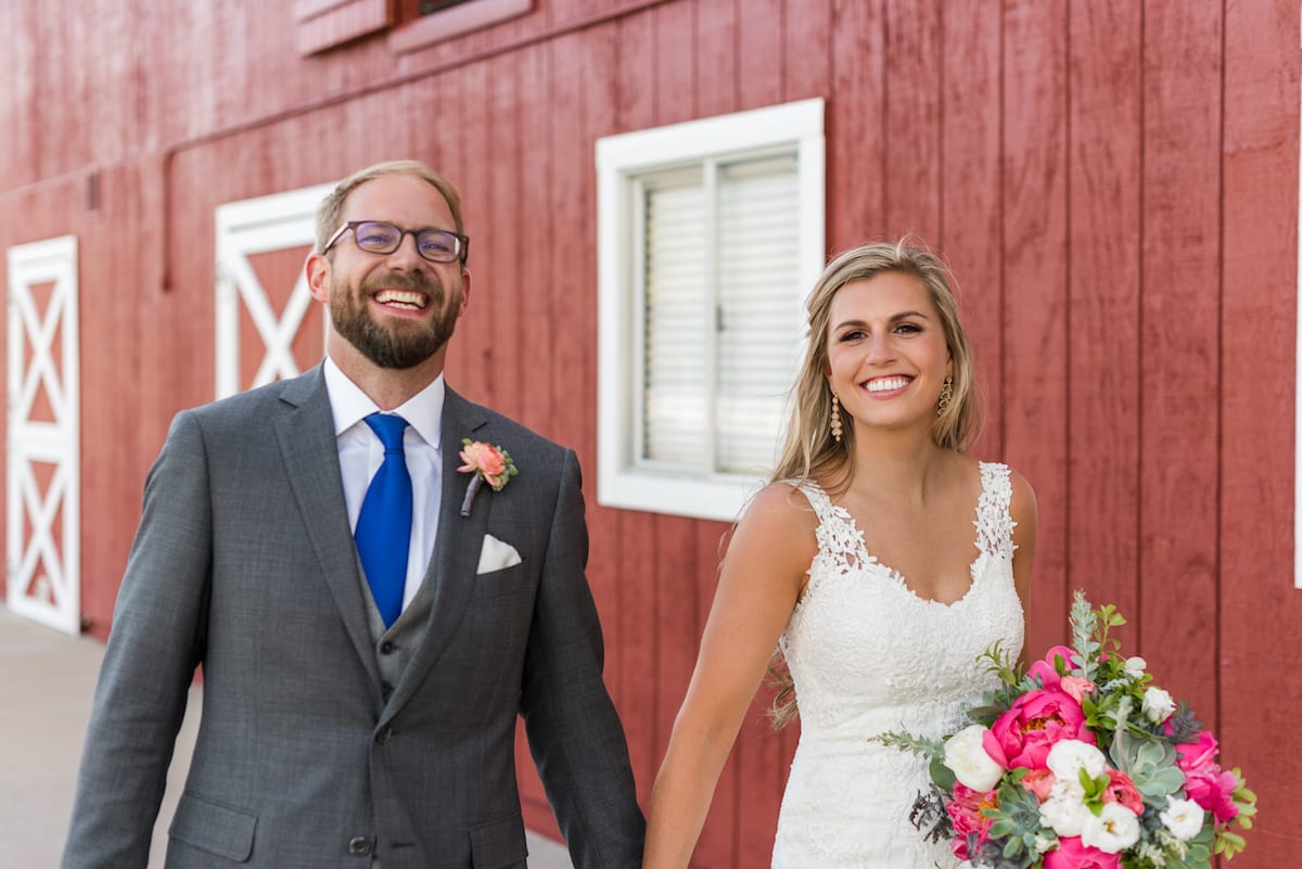 Taylor Wheeler patiently awaits his bride beneath an arch of succulents, vibrant pink peonies, and an old cow skull. (We promise, this will not be the first cow skull you see this afternoon!) His eyes scan the crowd before him, briefly, before resuming their place on the rustic red barn doors ahead. For Taylor and Tanna, this is the moment they have been waiting for.